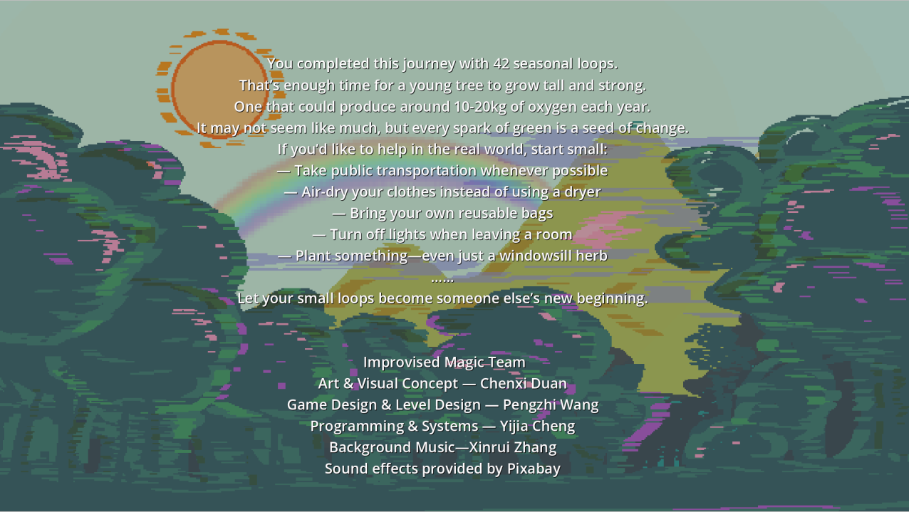 Congratulations on the beautiful project! It was a pleasure to play it. I really liked the seasonal mechanic and the well-designed puzzles. There's a whole universe of possibilities here.