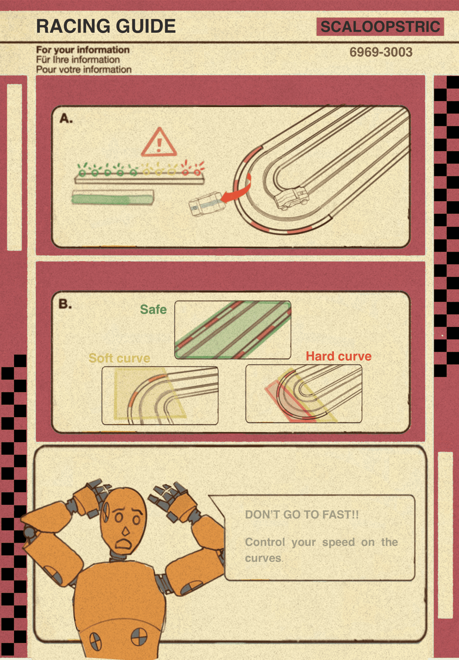 It uses an original color-coded system to know if you're going too fast and could go off the track.