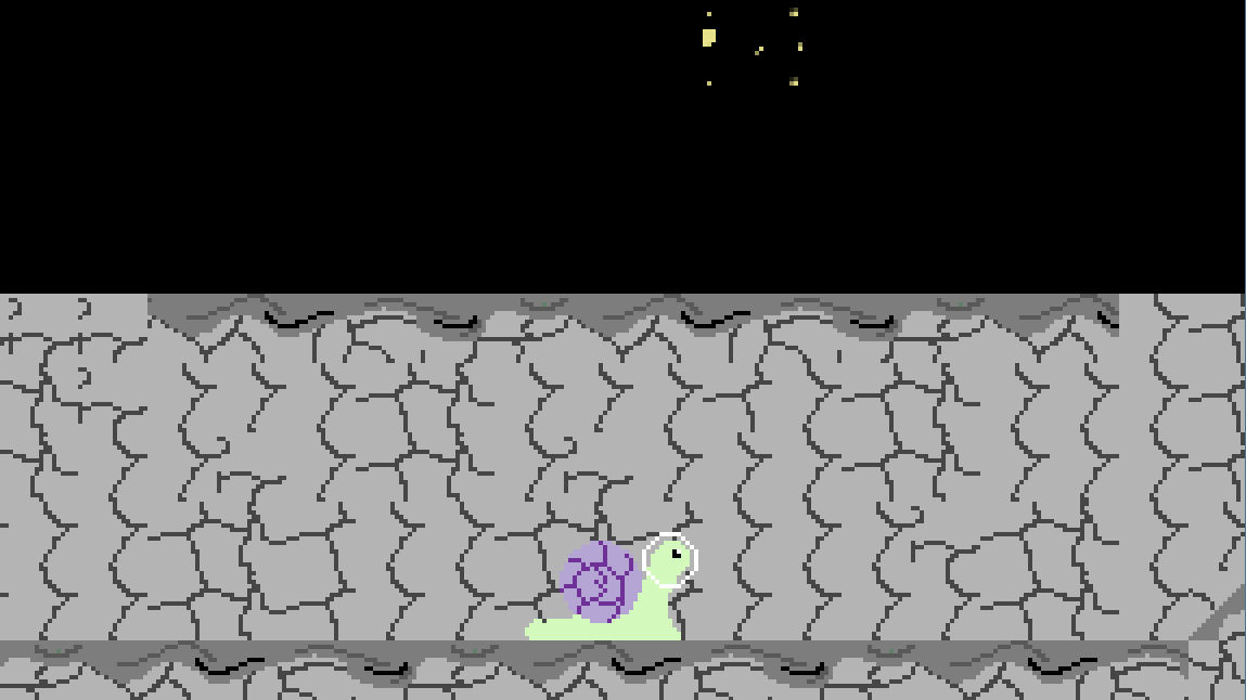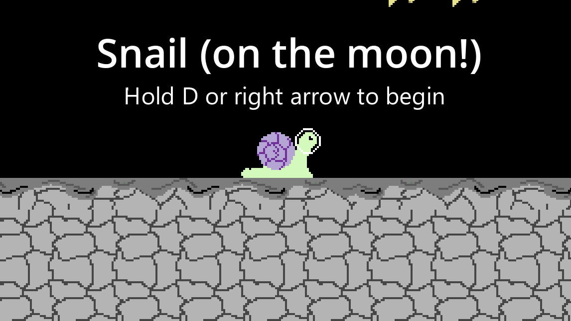 Good job for your first jam ! If I can drop a piece of advice I would say to have the moon rocks be a bit more different than the ground so you can see them better. Loved the parts where the snail went off screen.