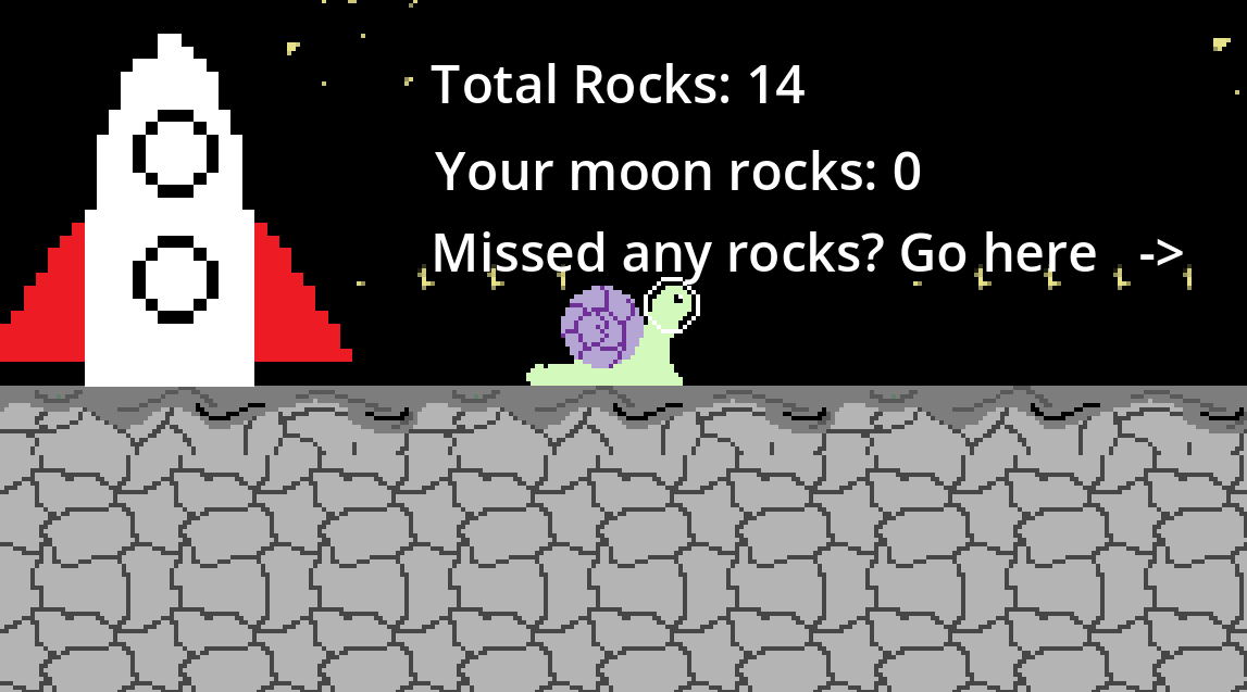 I loved the little snail's design! I didn't get how it fit the theme at first, but when I got to the end it clicked. I just wish there was more space to explore and hide moon rocks. This is awesome for a first game!