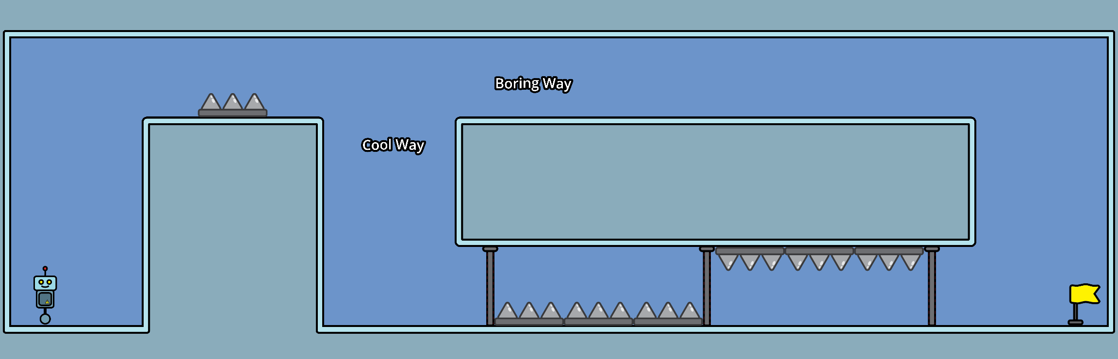 Interesting take on the looping instructions puzzle game. Would be nice to see which is the first programming instructions, as often I accidentally put the first instruction as the last (by intuition the top left is the first but apparently that's not the case). Also I see what you did for the "Boring Path" :>. Some of the SFX were quite loud and piercing, like the gravity switch sound, so might need some adjustments to the volume.