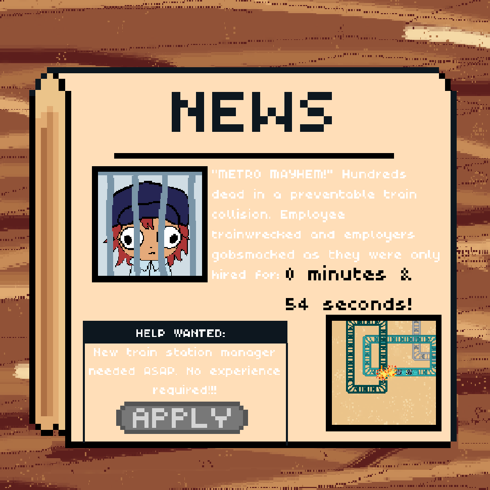 Really like this idea! Great take on the theme this year. The game is very stressful but fun haha. I really love how the restart screen is a newspaper and you hit apply to try again. Nicely done.
