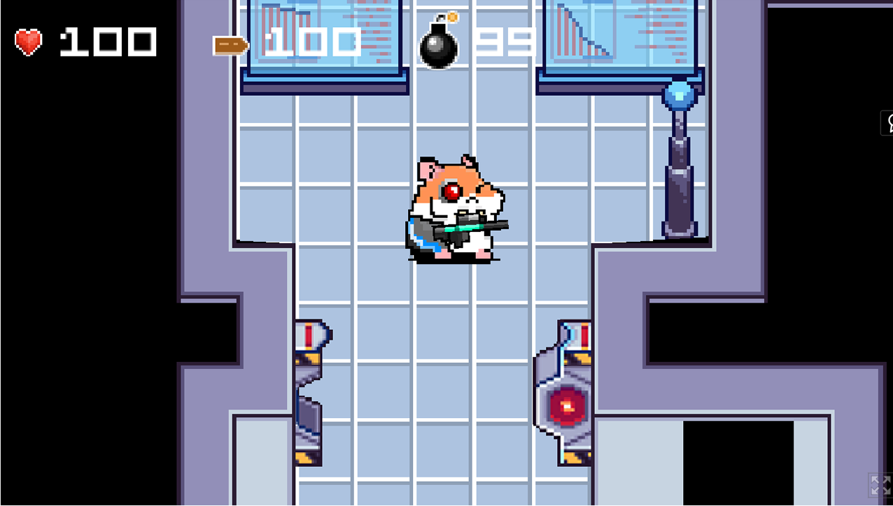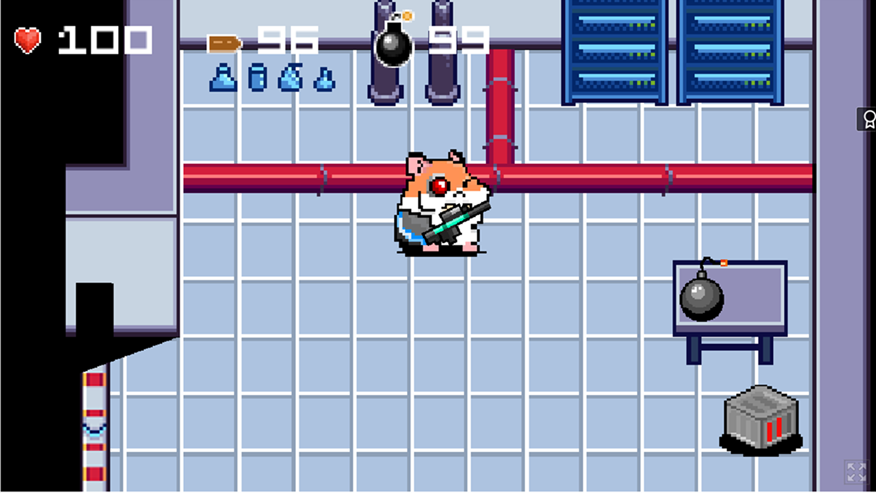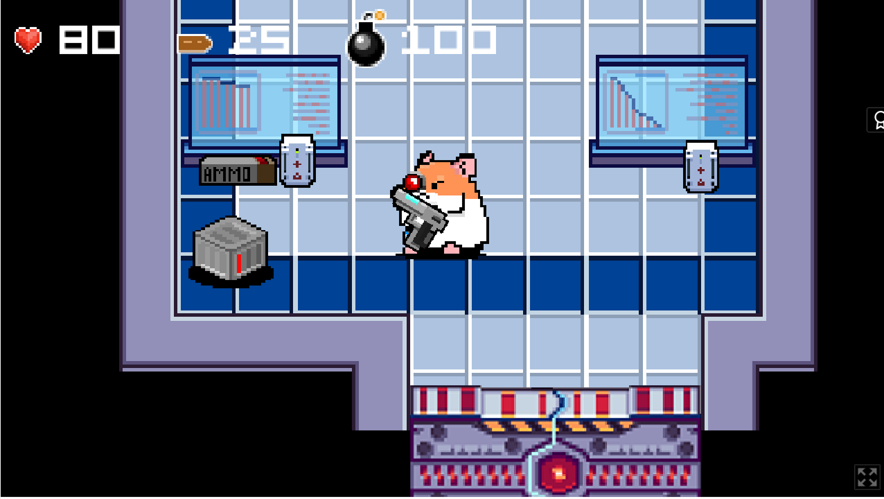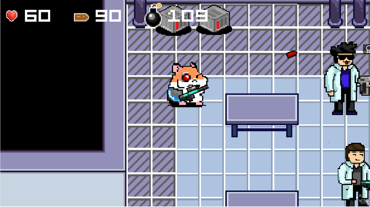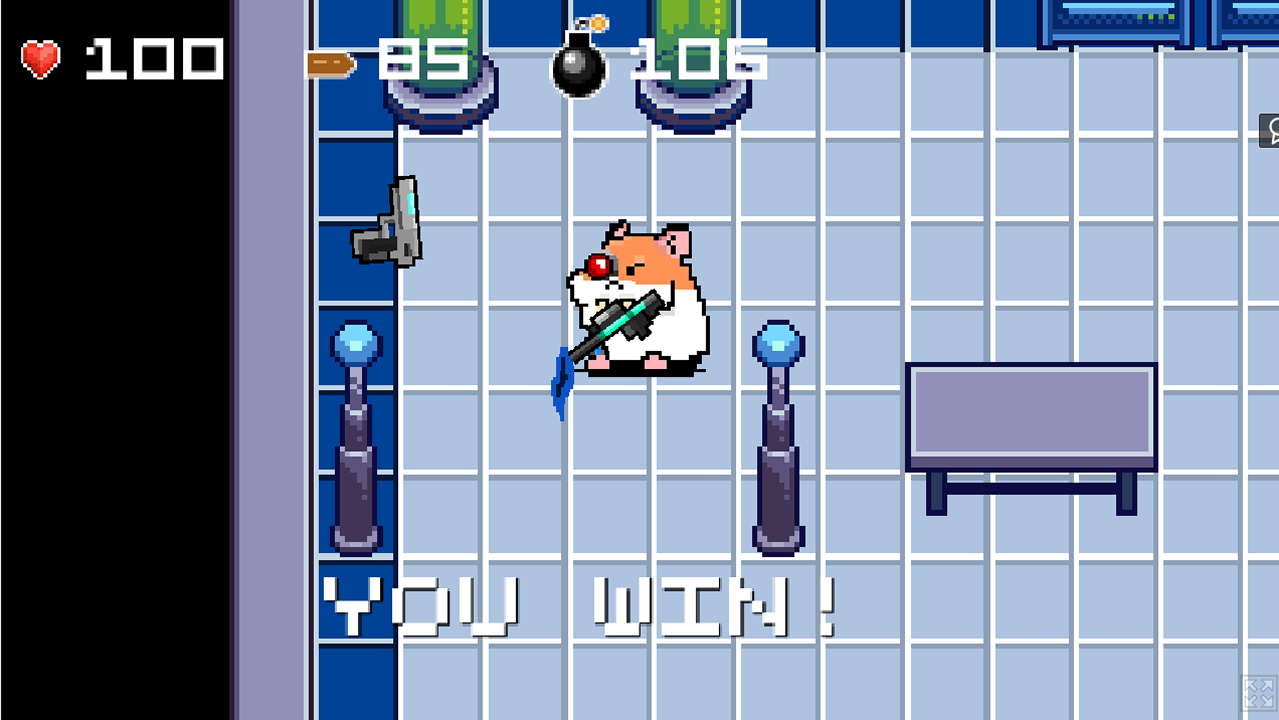 Cute game with awesome visuals and character designs! I like the map design and the simple loop back to the beginning of the level whenever you die. I felt that the player movement of the hamster and the enemies were a bit slippery/unsteady, and it would be nice to get some visible/audible feedback whenever bullets make contact with the hamster or an enemy! Also a volume slider would be useful. Nice work!