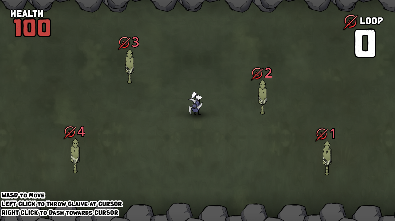 Very interesting idea for a game! I think the main mechanic of dashing through the glaive is pretty demanding of the player, and when the actual boss fights started, it kind of felt like I was playing two different games at once; when I actually hit a boss with the glaive, it felt somewhat coincidental rather than being a fully intentional action. Maybe the dash can go a little further and be marked as both a way to charge up the glaive and an evasive maneuver? I will also mirror Condimint's feedback and say I wish you could dash in the direction of movement rather than just the mouse; it is part of why the glaive mechanics are so demanding. With those things being said, the feedback was very good! I liked how the glaive and loop text changed colors and gained more effects.