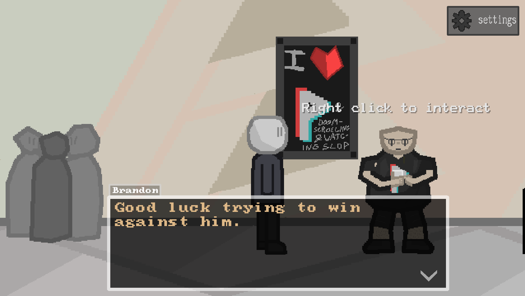 I found the memes funny my brain is fried, good idea. The controls could be better (wasd instead of arrows since you also use E). Couldn't get past the second match, the guy is actually him. Good job on the entry!