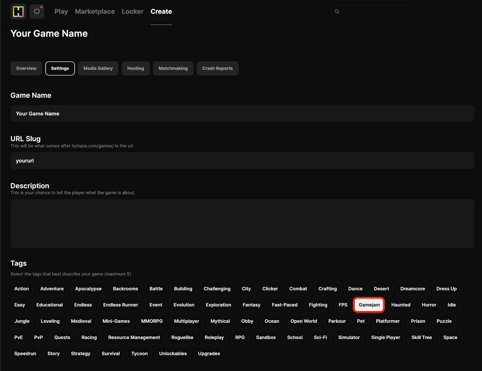 When creating your game's page, make sure to fill in all the required information according to the tutorial, and additionally make sure to select the “Gamejam” tag for it.