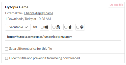 Click on the "Add External File" on the right hand side, and then paste in the URL to your game on HYTOPIA. It does not matter if it still hasn't been approved by the HYTOPIA team, as you will already have your game URL prior to their approval.