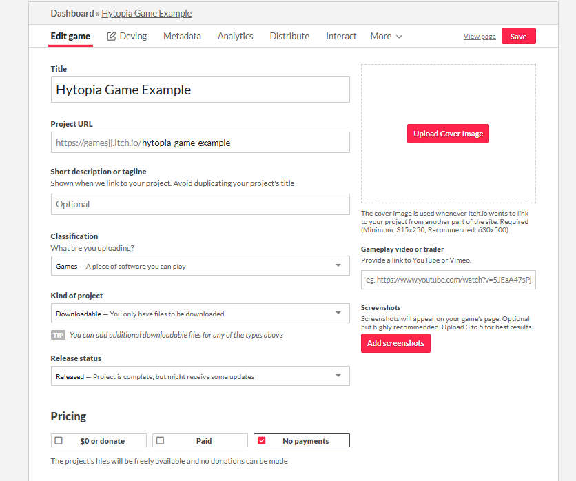 To create your itch page, make sure you have your HYTOPIA URL handy. You will create your desired URL when you submit your game over https://hytopia.com/create/. This URL will start working once your game is approved by the team and published to HYTOPIA, it is the link to your game. It will look like this: "https://hytopia.com/games/yoururl/ "