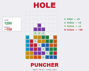 Tetris-meets-puzzle — place pieces on a grid to create holes in specific patterns. Score vs penalty system, 3 board widths. Real-time leaderboard, 3 languages.