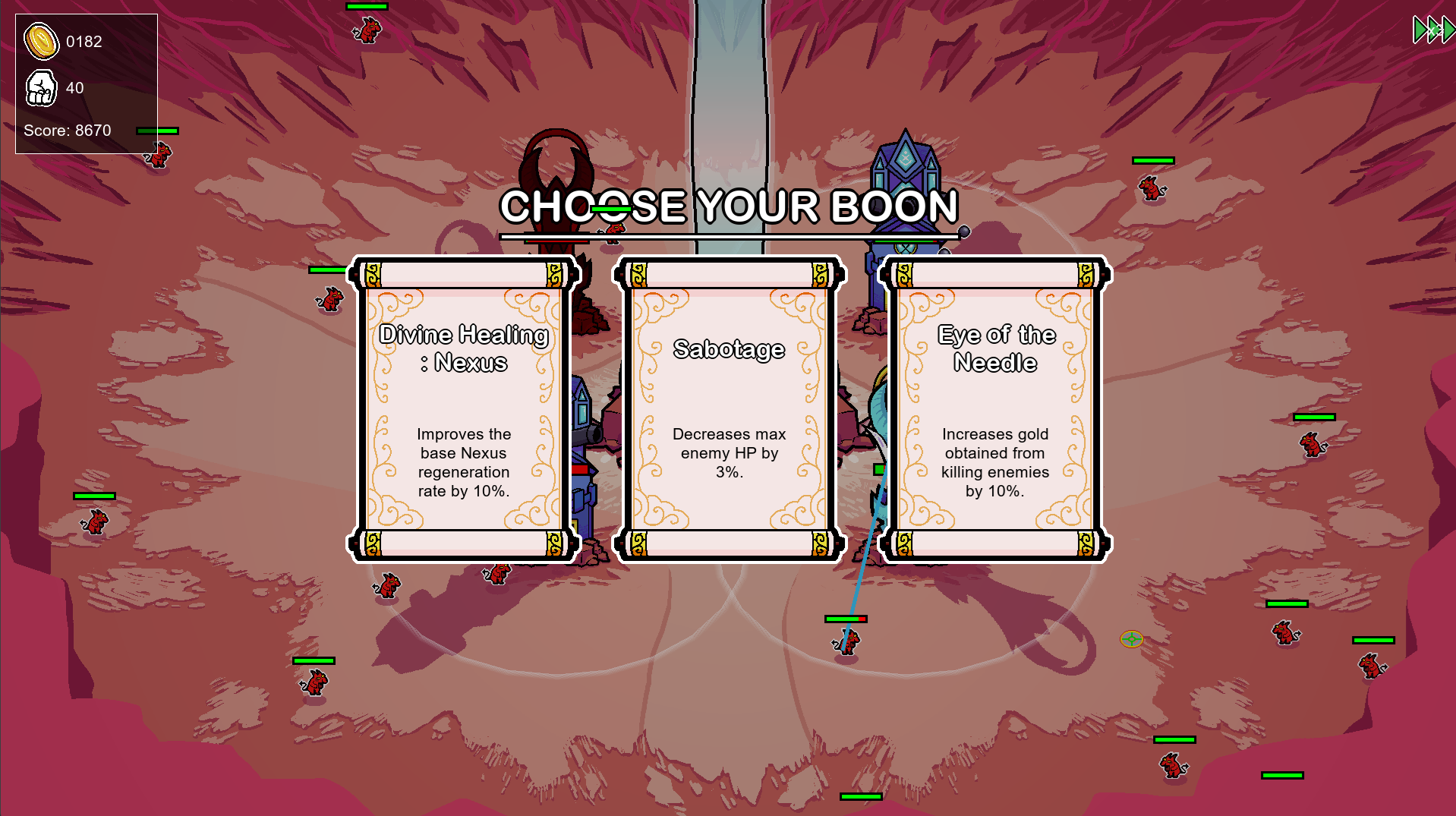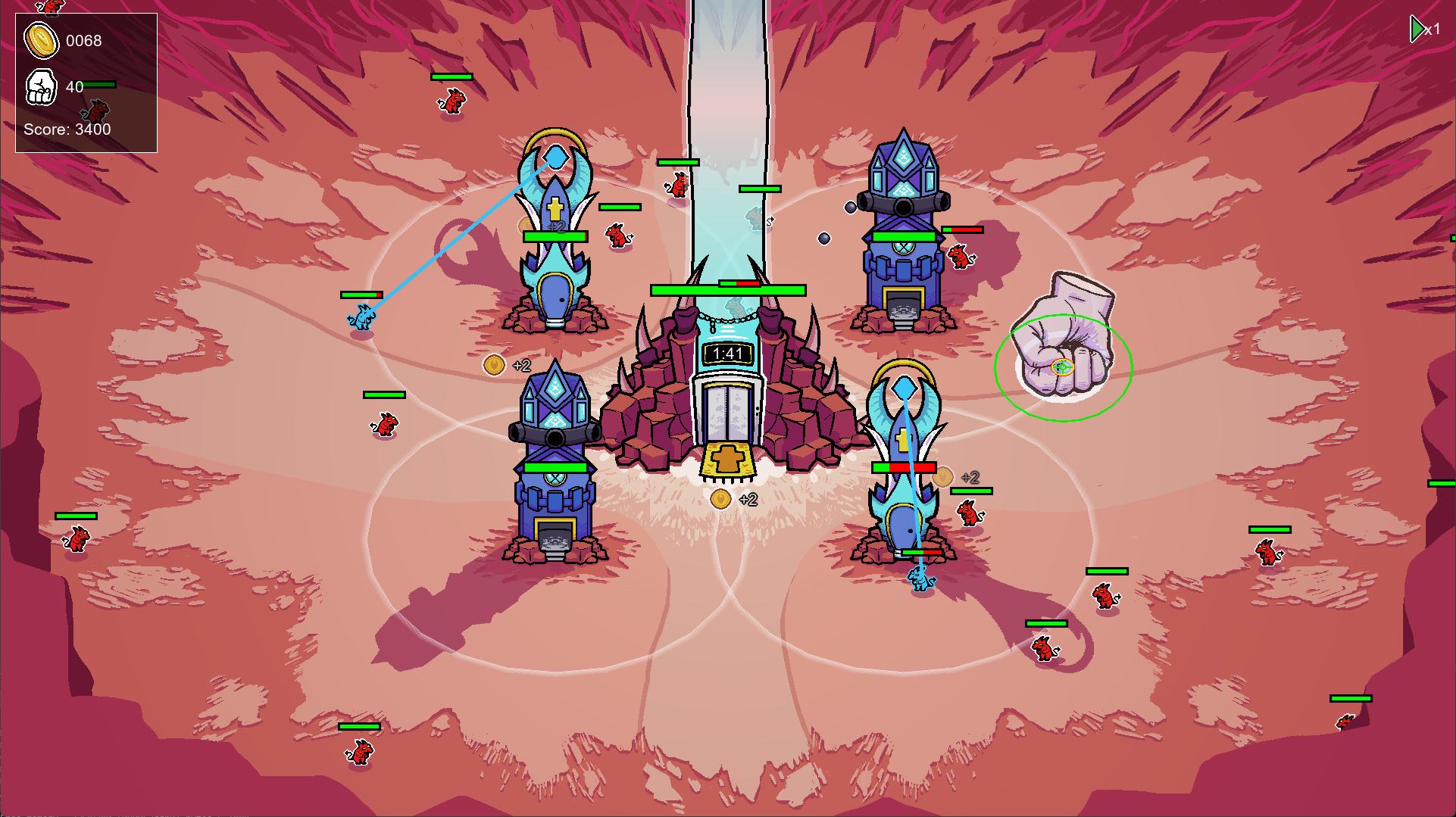Great game! It was fun! I wish I could just pound my fist anywhere, even on the towers. It was difficult to have to avoid the towers when clicking. It looks good and I thought the pacing was good - rounds not too long, only upgrading towers between rounds, some pauses in between the run to choose upgrades. Well done!