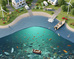 una imagen REALISTA con un lago, que tenga en su superficie una pequeña barca, y bajo esa barca un camino con el agua mas limpia donde se veran peces y en el resto del agua, será mas oscura y llena de basura como plasticos, bolsas, botellas. En la parte central de la imagen habran aerogeneradores, casas con paneles solares, cubos de reciclaje, y personas plantando arboles y flores.