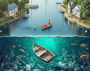 una imagen realista con un lago, que tenga en su superficie un bote, y el agua c limpia donde se veran peces y en el resto del agua por debajo, será mas oscura y llena de basura. En la parte central de la imagen habran molinos eolicos, casas con paneles solares, cubos de reciclaje y flores. se mostrara la siguiente frase "Let's take care of it, because beauty is not just"