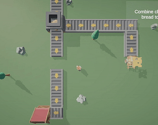 Very nice game! Essentially a small Automachef, but with more space and random generation. The only complaint really is UI - you can place something while switching buildings, and that combiners can hold infinite amount of stuff, so sushi belting all ingridients to single combiner was very effective