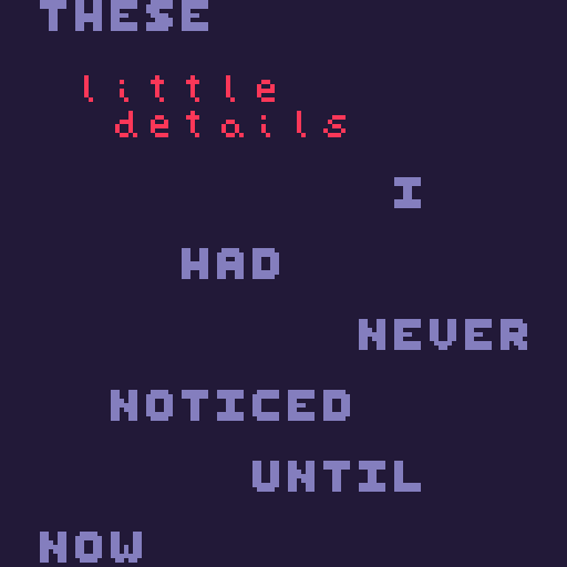 It's the June Bitsy jam! This is the 51st monthly #bitsyjam - to participate just create a game (of any size) using Bitsy with the theme of "little details / these little details I had never noticed until now".
