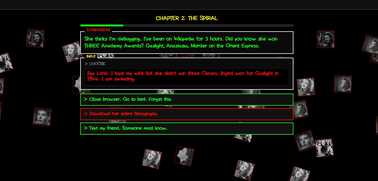 A short, text-based comedy/semi-educational game about Ingrid Bergman.