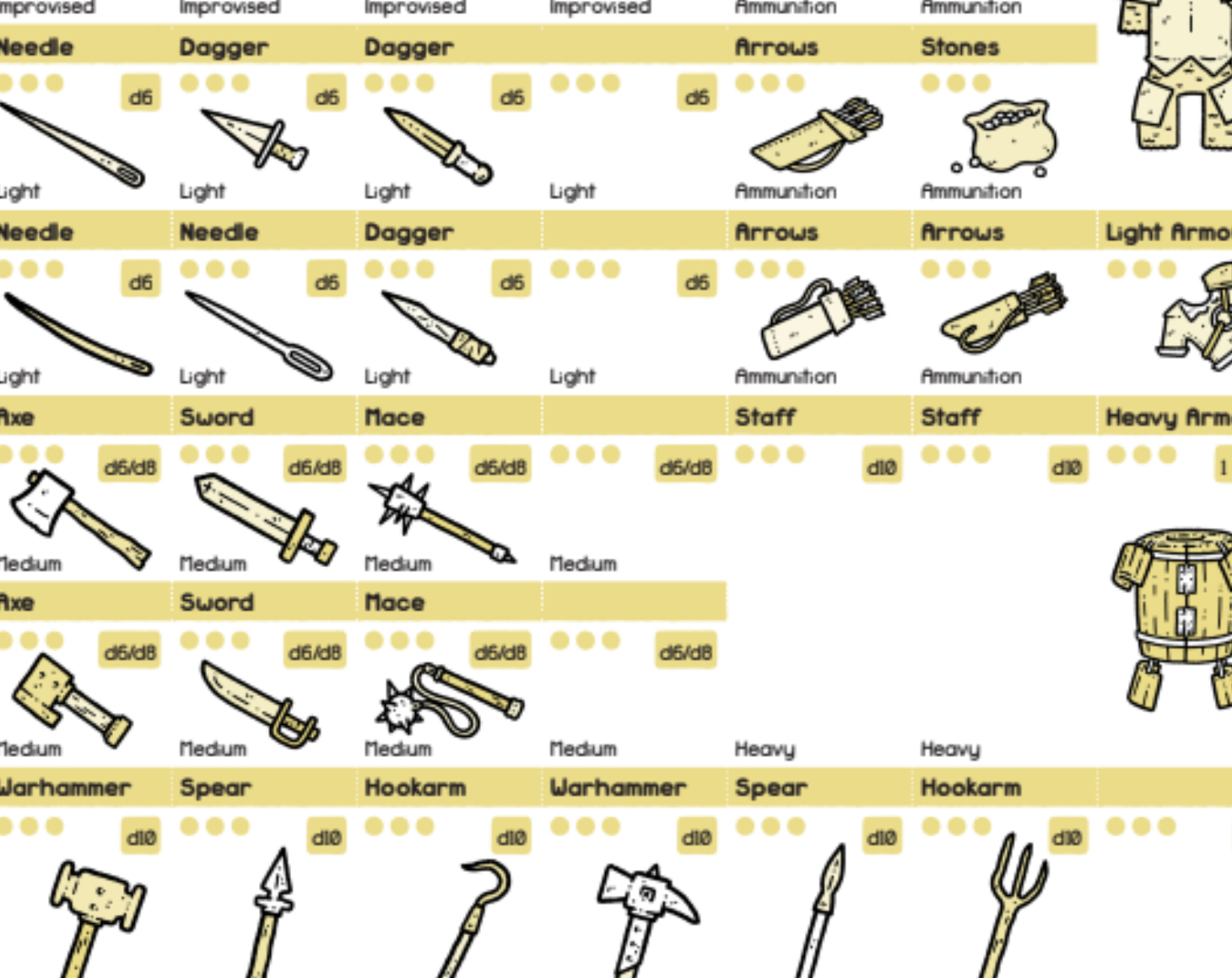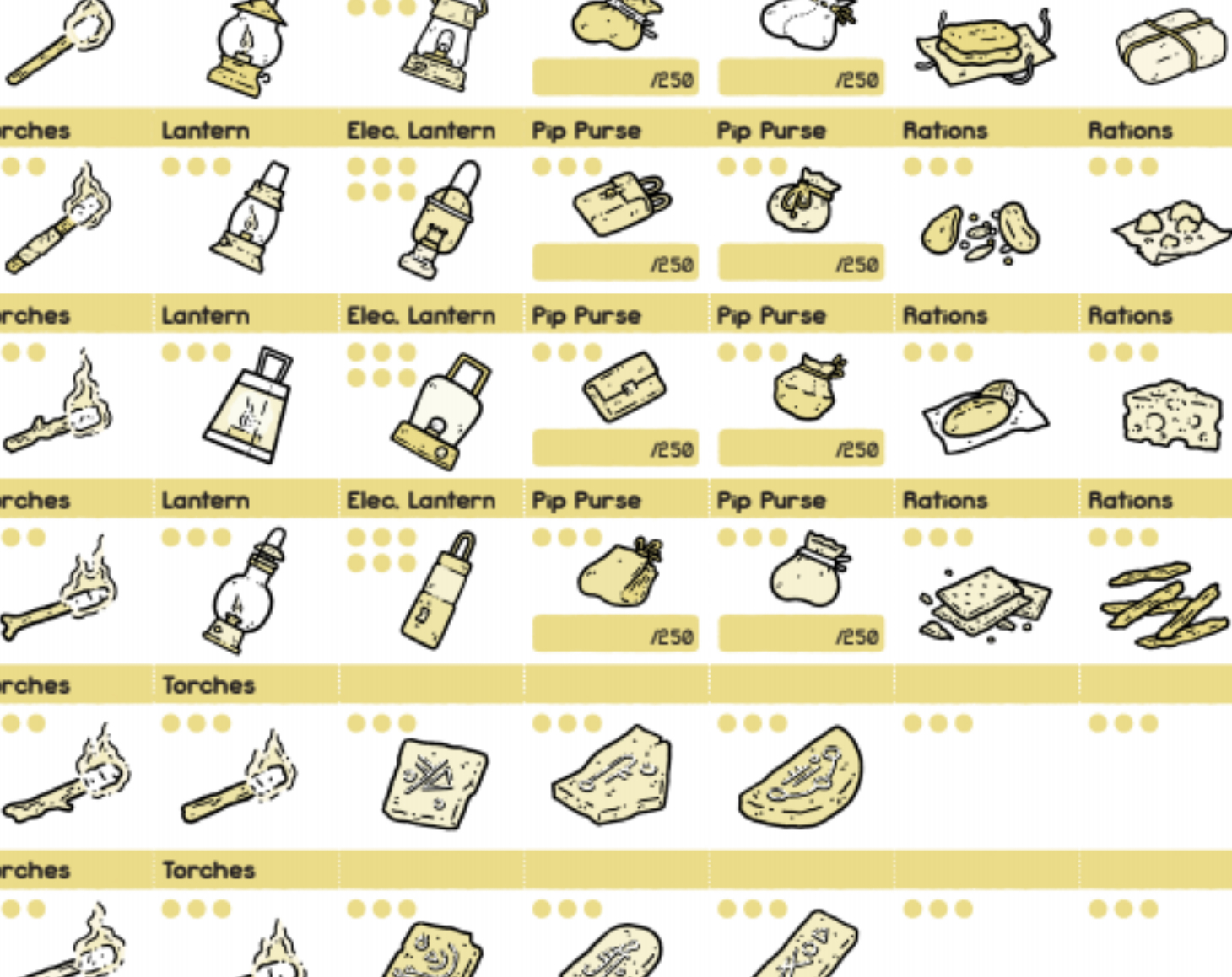 I wanted to make my own set of Mausritter items, so here they are! I wanted to have different art variants for items that appear multiple times like rations and torches and whatnot.