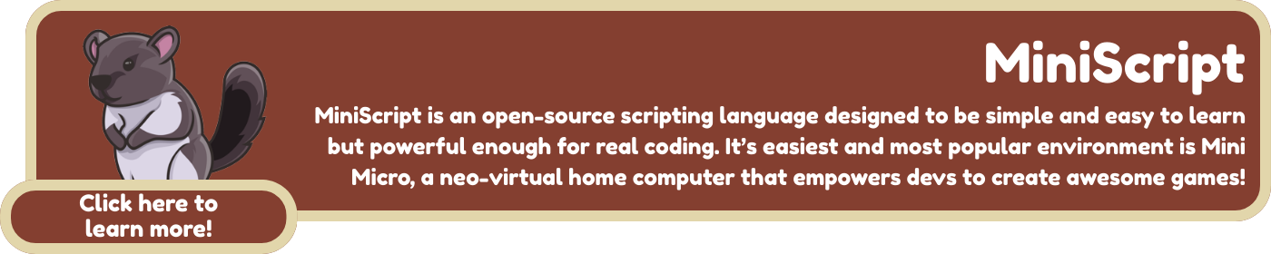 Be sure to add the tag #miniscript in your itch.io page as well as joining our Discord community to let us know you've used MiniScript.