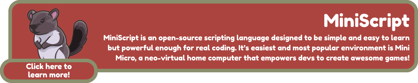 Be sure to add the tag #miniscript in your itch.io page as well as joining our Discord community to let us know you've used MiniScript.