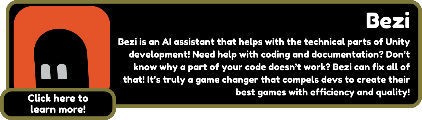 | 🎖️ Best Games Made With Bezi: If you used Bezi in your game, please add the tag #bezi to your itch.io page so we know your game is eligible! 🥇 1st Place: - $30 USD via PayPal - A signed, digital certificate of achievement 🥈 2nd Place: - $20 USD via PayPal - A signed, digital certificate of achievement |