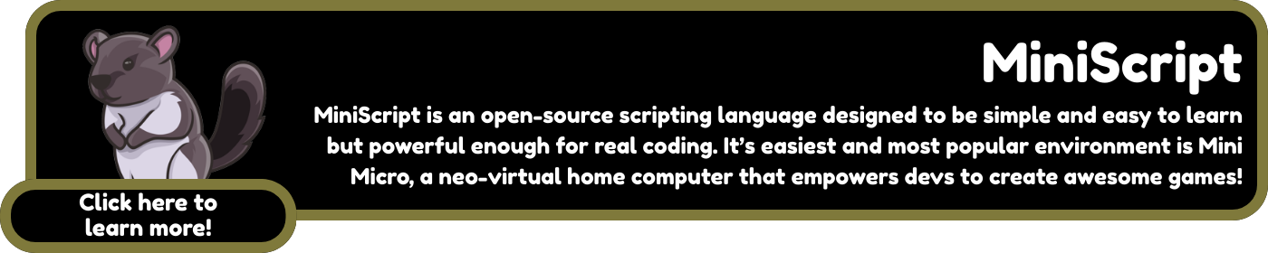 | ⚙️ Best Game Made With MiniScript: Be sure to add the tag #miniscript in your itch.io page as well as joining our Discord community to let us know you've used MiniScript. 🥇 1st Place: - 25 USD via Paypal - A signed, digital certificate of achievement |