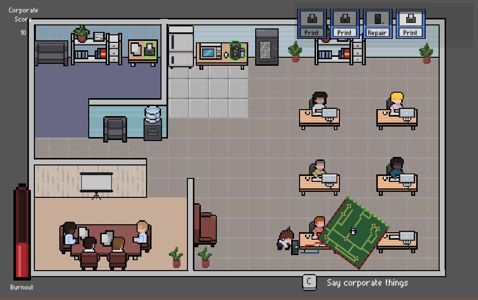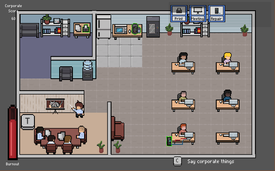 I really love your concept and the execution! I really felt overwhelmed while playing so I guess it's a success ahah. The "say corporate things" action was the best part. Great work!