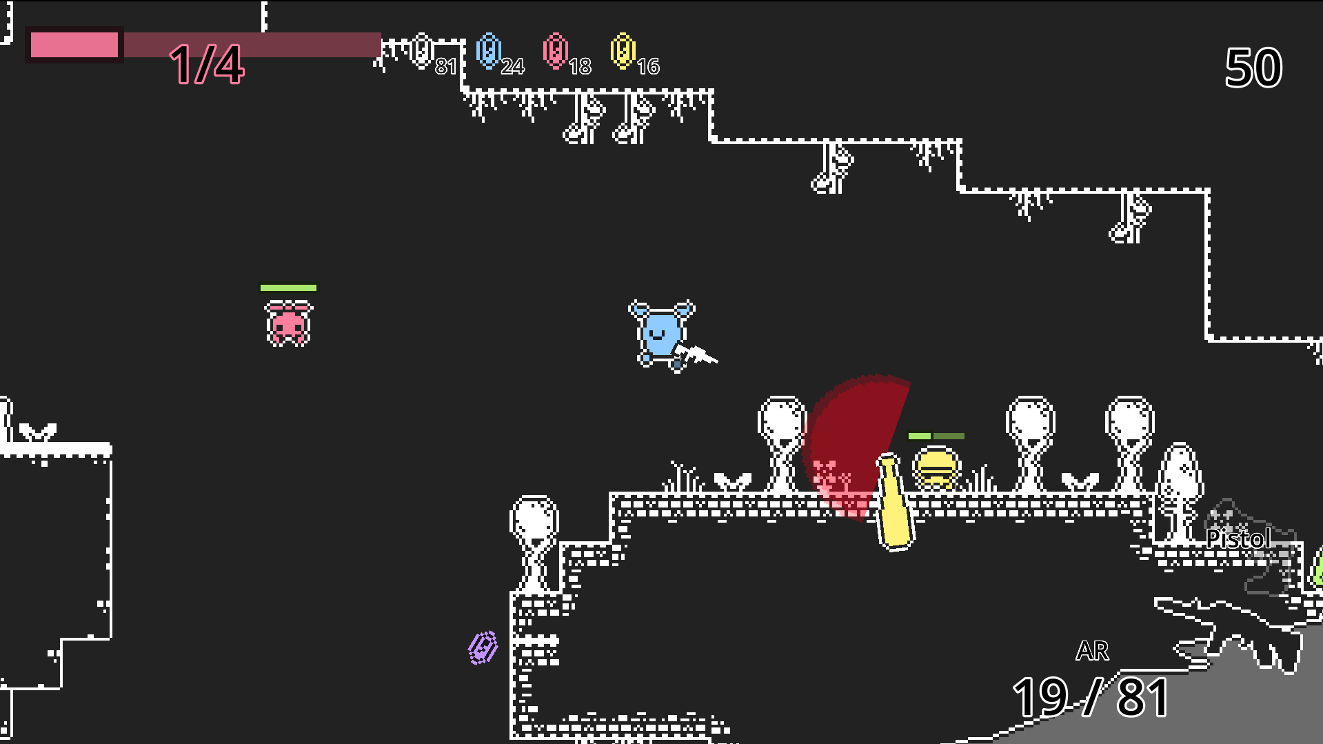 You will have to absorb enemies to get shards and some temporary buffs. The shards are used as projectiles and as currency to unlock weapons.