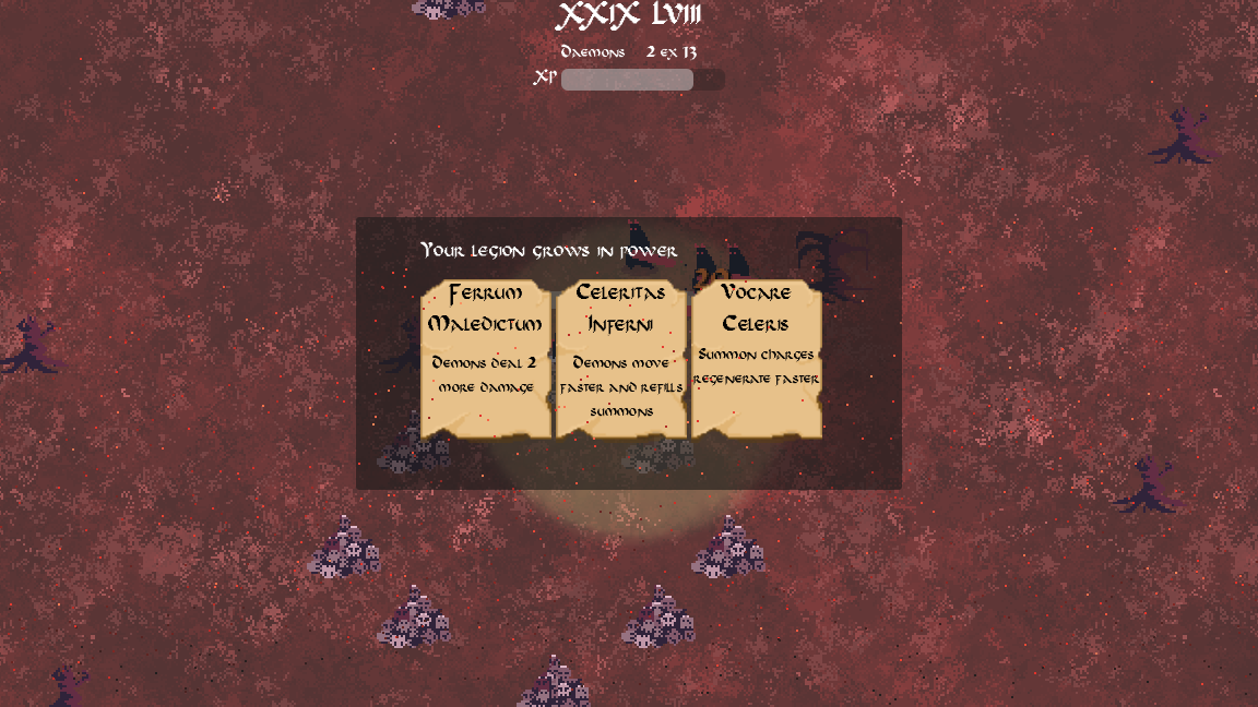 VERY satisfying to have a billion demons slog the Solomon AND the browser down:) It did encourage me to download the windows build though! The music, art and sfx definitely put me in the SLAUGHTER mode. Curious, how big can your legion actually get? I enjoyed this.