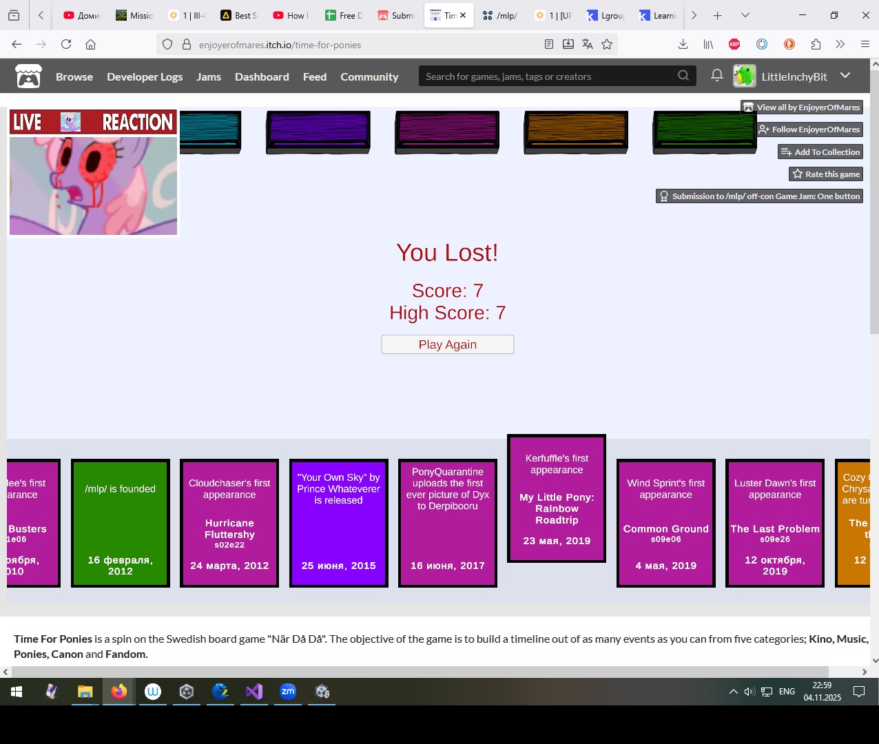 It's the best game for brony party. Really, it should be played on some little get together. Live reaction is clever and funny addition too. Kino, Musci and Fandom are all mostly related to fandom, and questions about them are hard to me. My high score is measly 7. I mostly recommend this game to understand how well you know mlp