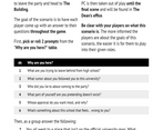 You’ve been invited to the freshmen party. For whatever reason, you decide to leave the party and head to The Building. The goal of the scenario is to have each player come up with an answer to their questions throughout the game.