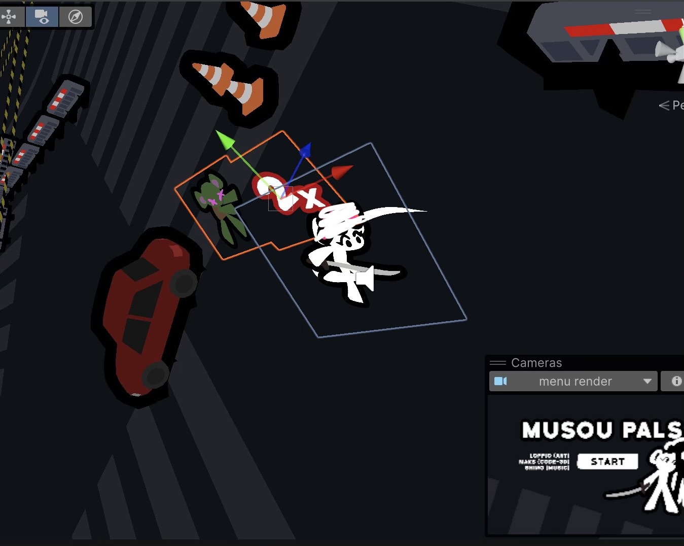 Thank you! The sprites were done by loppio but in terms of putting them in the 3D stage: it's nothing crazy, the sprites are just on quads that are tilted away from the screen a bit (see attatched image). Also repurposed some of my shaders to minimize clipping of the sprites through 3D objects but you'd be much better off just using camera stacking and/or messing with render queue order.