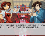 Hahahaha, this is amazing! I love the art style of walking around the pizza parlor, but maybe next time, start with the main game part so you have time to finish? (Unless the story was really about how little gameplay matters in a story, if it can be just replaced by title cards saying 'here's a game'...)