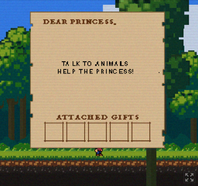 VERY cute, VERY cozy... but I had a few moments where I was asking myself "is this game trolling me"? Because I think the item spawned in such a way that it made me take the LONGEST path possible to collect everything. If you make the wrong guess and start walking to the right (alllllllll the way to the princess statue... which is kind of a red herring because it never did anything) and the item isn't there... you have to walk ALLLLLL the way back to the left side. And unfortunately I made a few wrong guesses, so my player experience had multiple: "i made a bad 50/50 guess and now the game's wasting my time". Everything about this game's aesthetic and atmosphere was on point tho. Excellent graphics and colors, likeable characters, and cool CRT + weather effects and all that... but the gameplay undermined it a little bit for me.