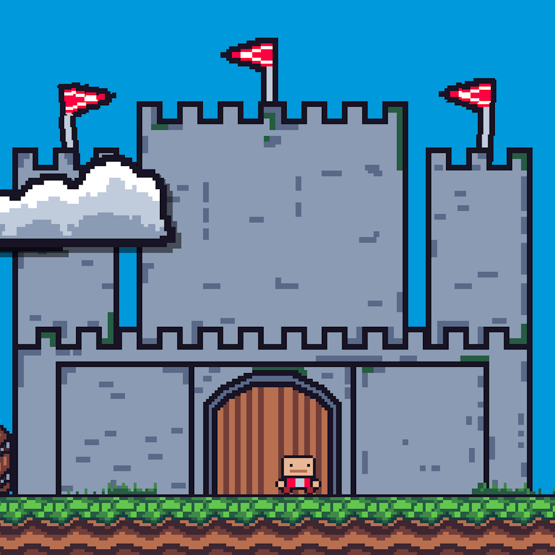 A pixel art dos personagens é mais simples, mas são belas, mas a pixel art de background e objetos é muito bonita, parabéns! Gostei muito do background, das árvores, do castelo, da cena do castelo por dentro.