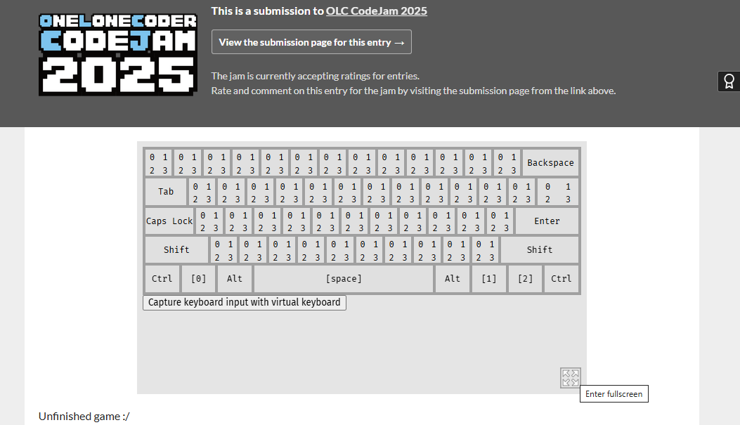 Sorry, the entry is in a very incomplete state at the moment. I wanted to share my progress at the end of the jam despite that, both as accountability to myself and so that I have an jam entry that can be finished after the rating period. Thanks!