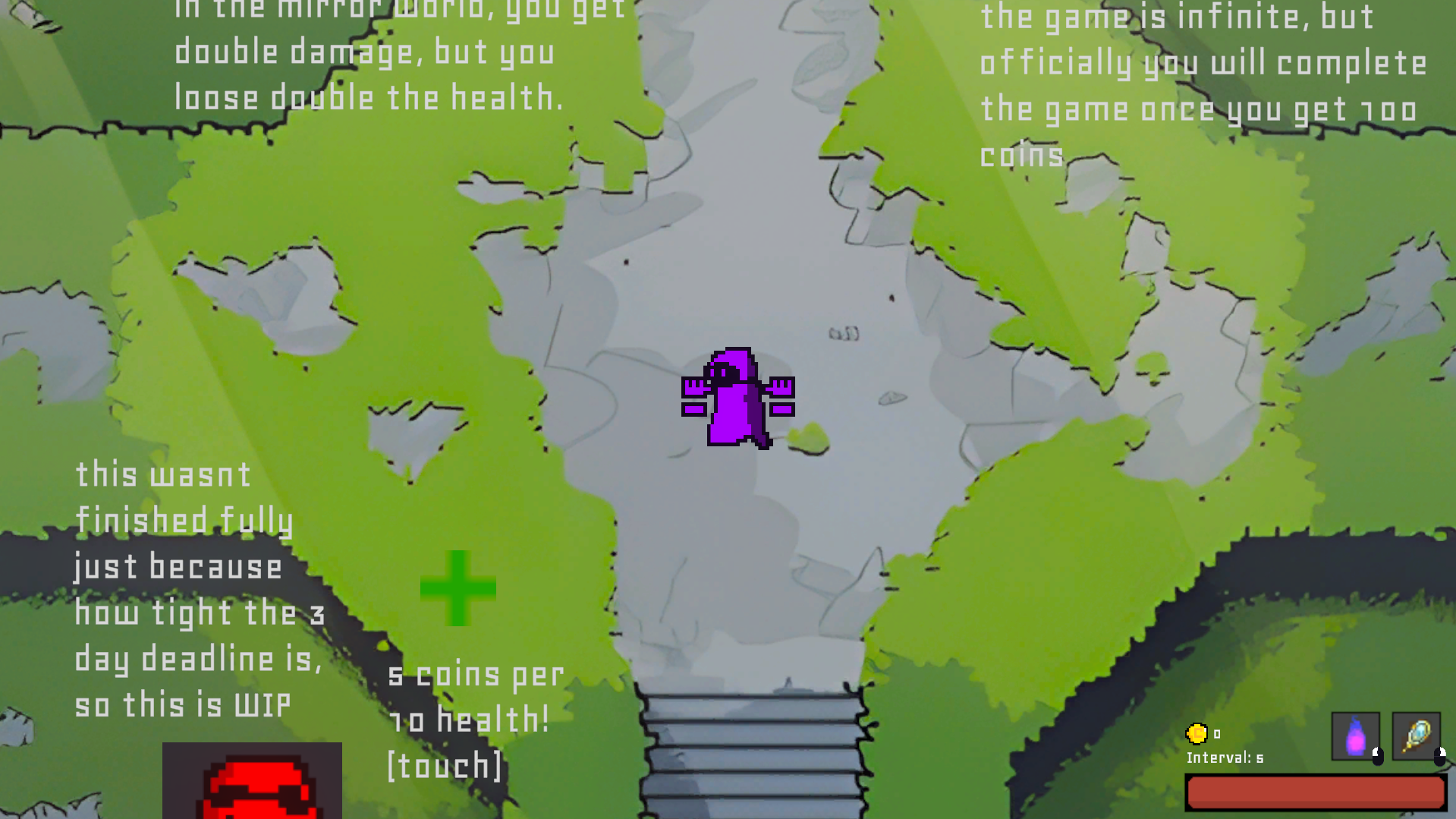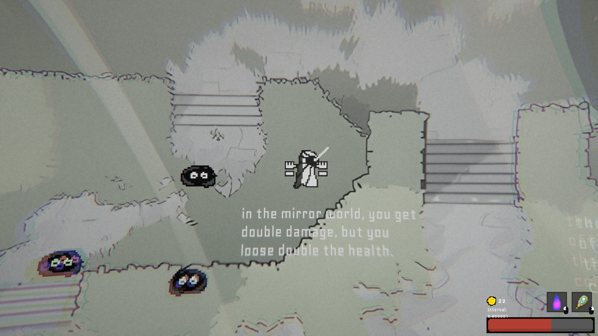 thanks! yeah, the initial purpose of this mirror thing was to dodge bullets from bosses (instead of just rolling), or activating platforms/disactivating walls. but there just wasnt enough time. maybe i should finish the initial idea?