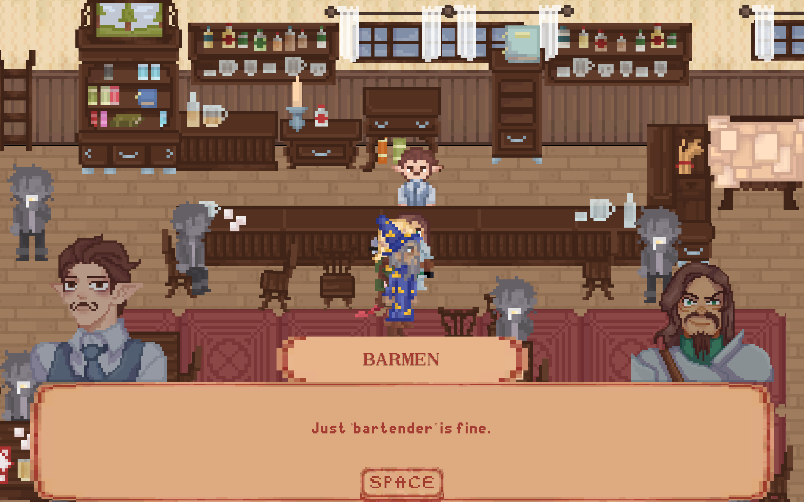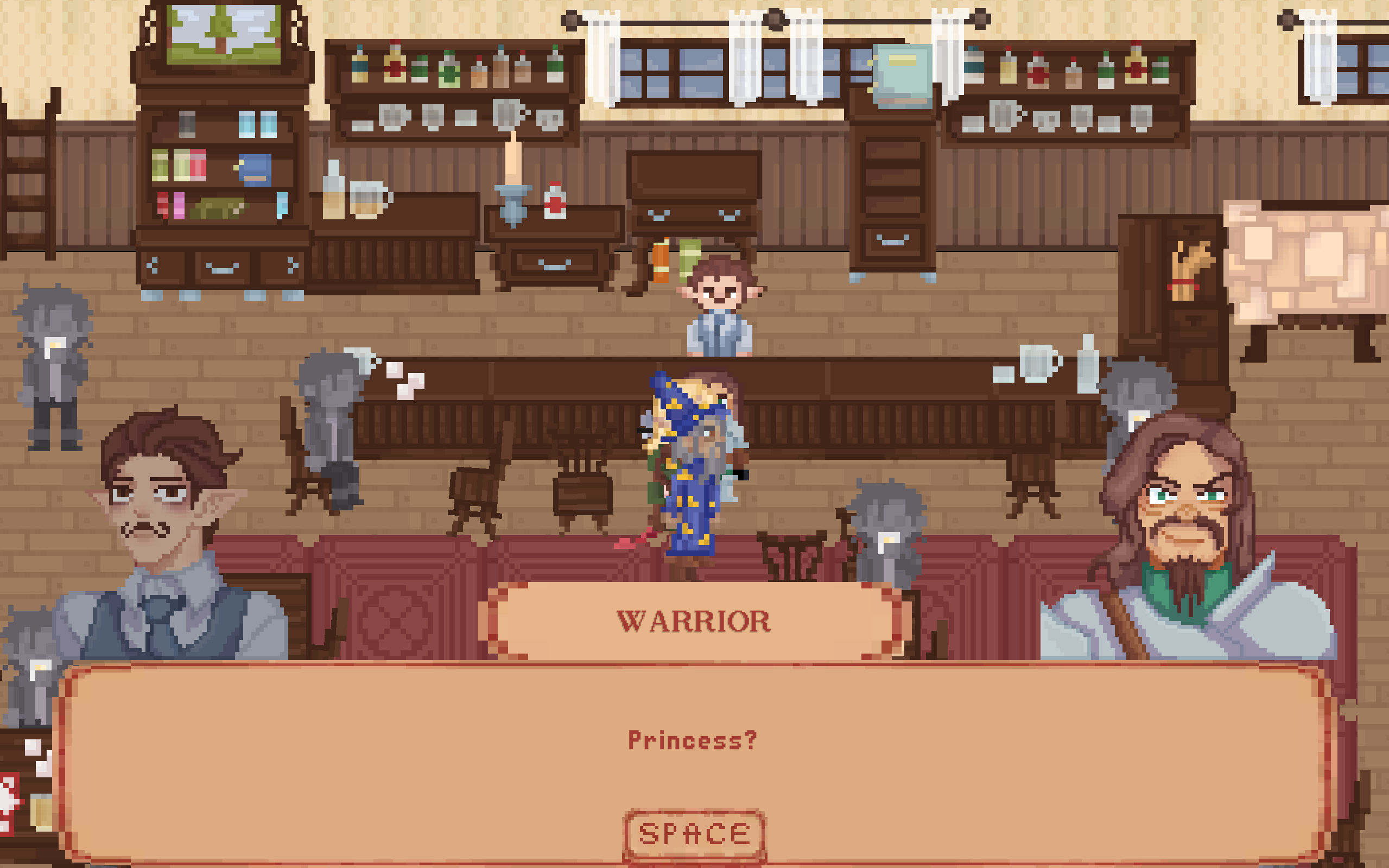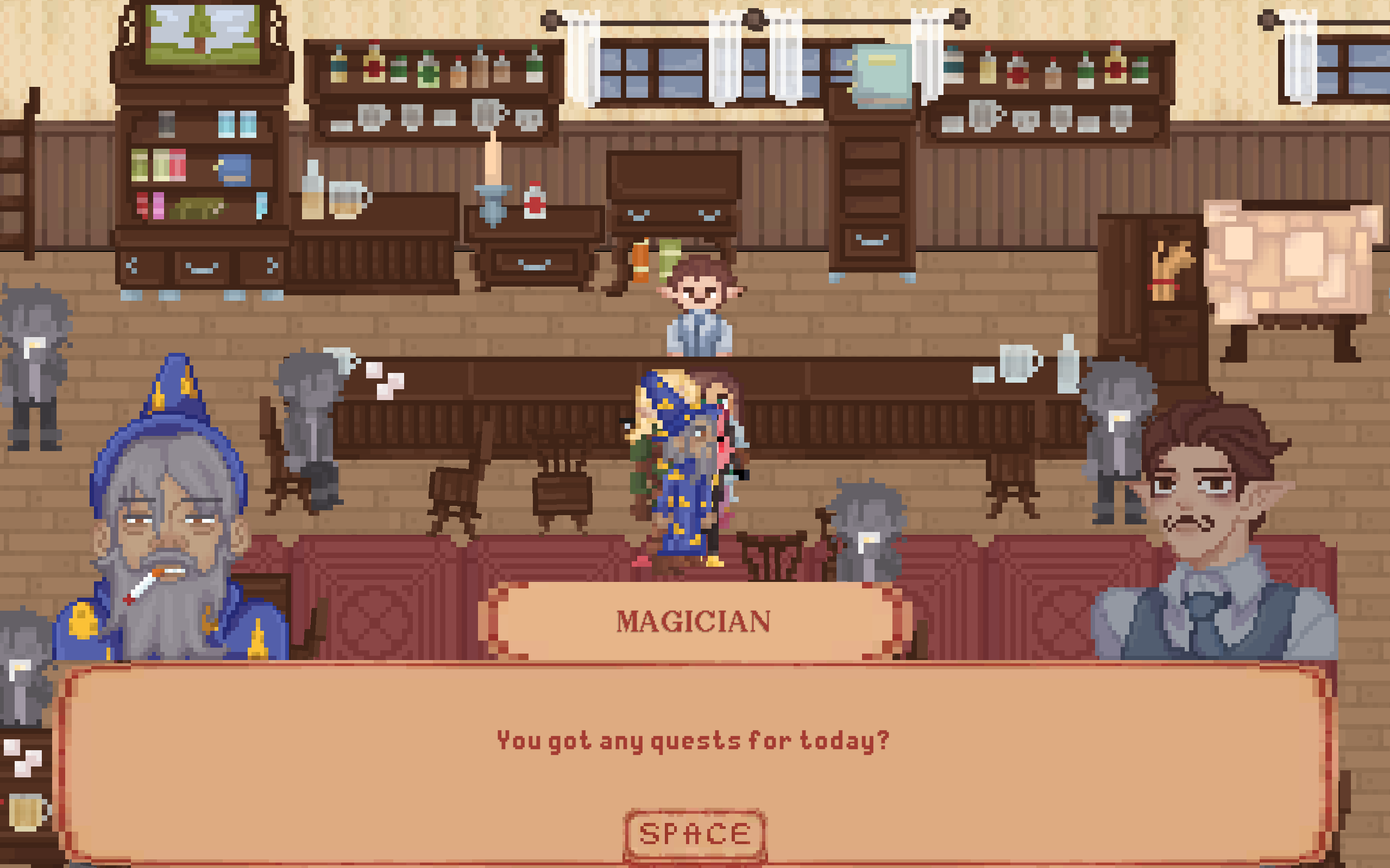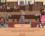 The pixel art is great, the music is great, the writing is great! Expressive character sprites in response to dialogue is done well. The music personally gives me an heir of mystery, if thats the intended effect then good job! this is a nice vertical slice, and instantly started bonding with the characters in the short time frame. Love the wizard with the cig too, he seems to have had a rough time. Unfortunately, I got hard locked when i tried to leave the bar for the second time at the dialogue: Archer: "Dont yell, you idiot", and i could not progress the dialogue. But what i saw, its very clear everyone involved seems passionate about what they are making in a short time frame. Would love to see more of this, great job!
