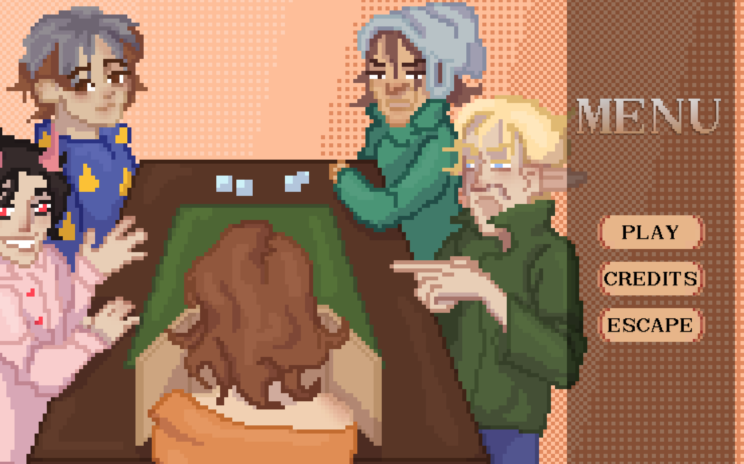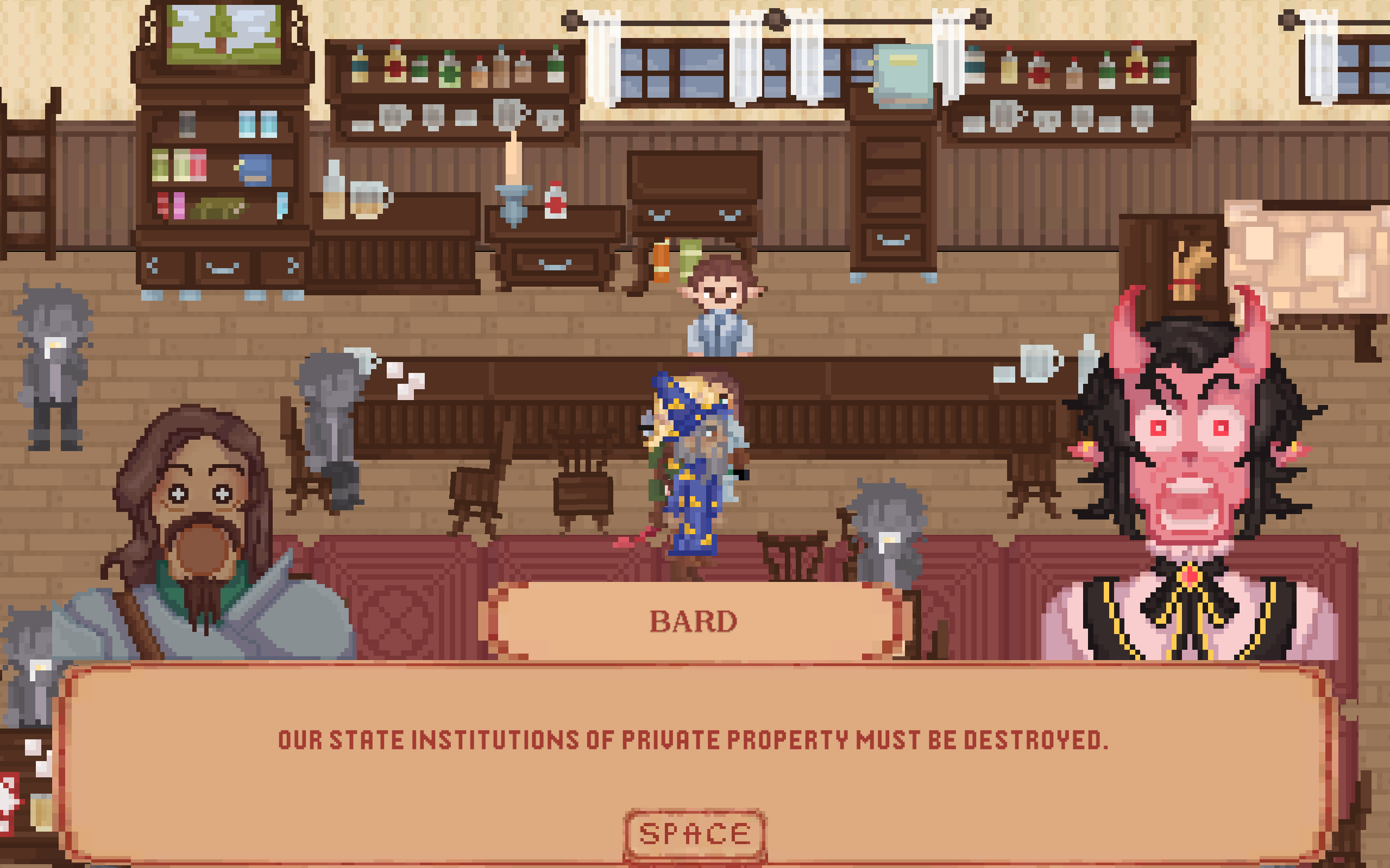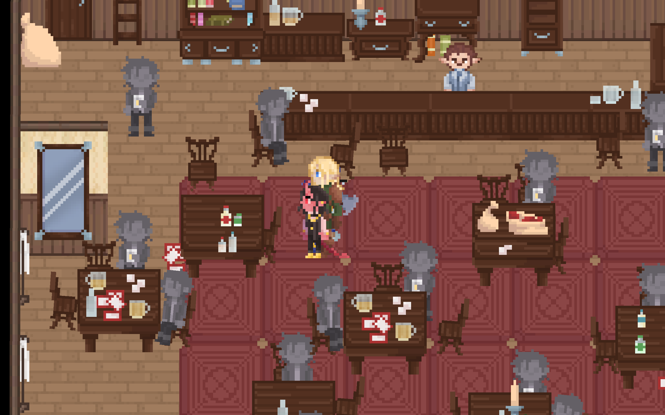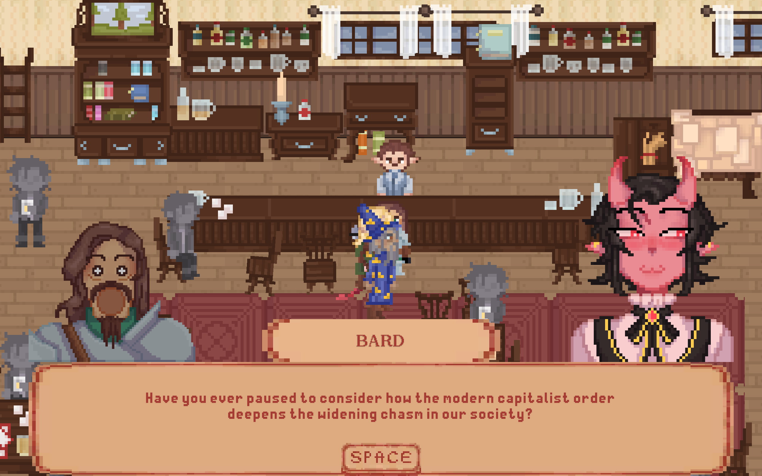 The pixel art is great, the music is great, the writing is great! Expressive character sprites in response to dialogue is done well. The music personally gives me an heir of mystery, if thats the intended effect then good job! this is a nice vertical slice, and instantly started bonding with the characters in the short time frame. Love the wizard with the cig too, he seems to have had a rough time. Unfortunately, I got hard locked when i tried to leave the bar for the second time at the dialogue: Archer: "Dont yell, you idiot", and i could not progress the dialogue. But what i saw, its very clear everyone involved seems passionate about what they are making in a short time frame. Would love to see more of this, great job!