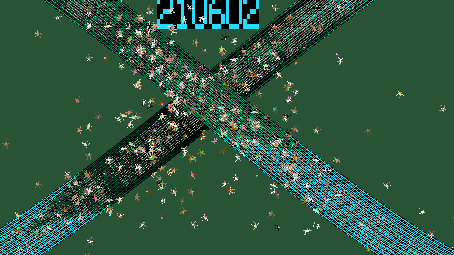Thanks for the valuable feedback, thanks for playing! I'm so excited to hear that someone tried it! The one horse spawning is a floating horse spawning. I added those for the extra layer and to show off the use of flow fields to control them. But if you look at the "track" it also spawns 1000+ horses although they start to stack after a while they are still being simulated. I made the spawning increase exponentially just to reduce the time it takes to get to a million because I didn't want the player to lose interest. Thanks again!
