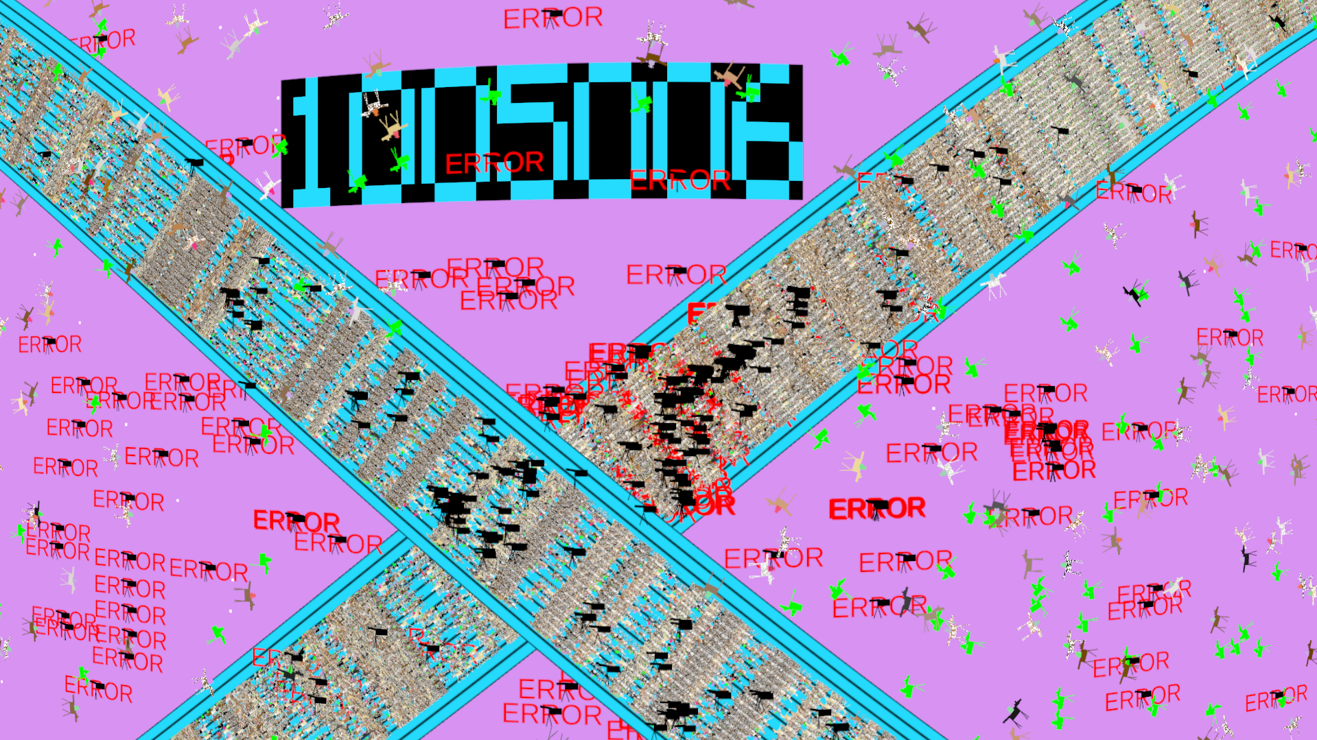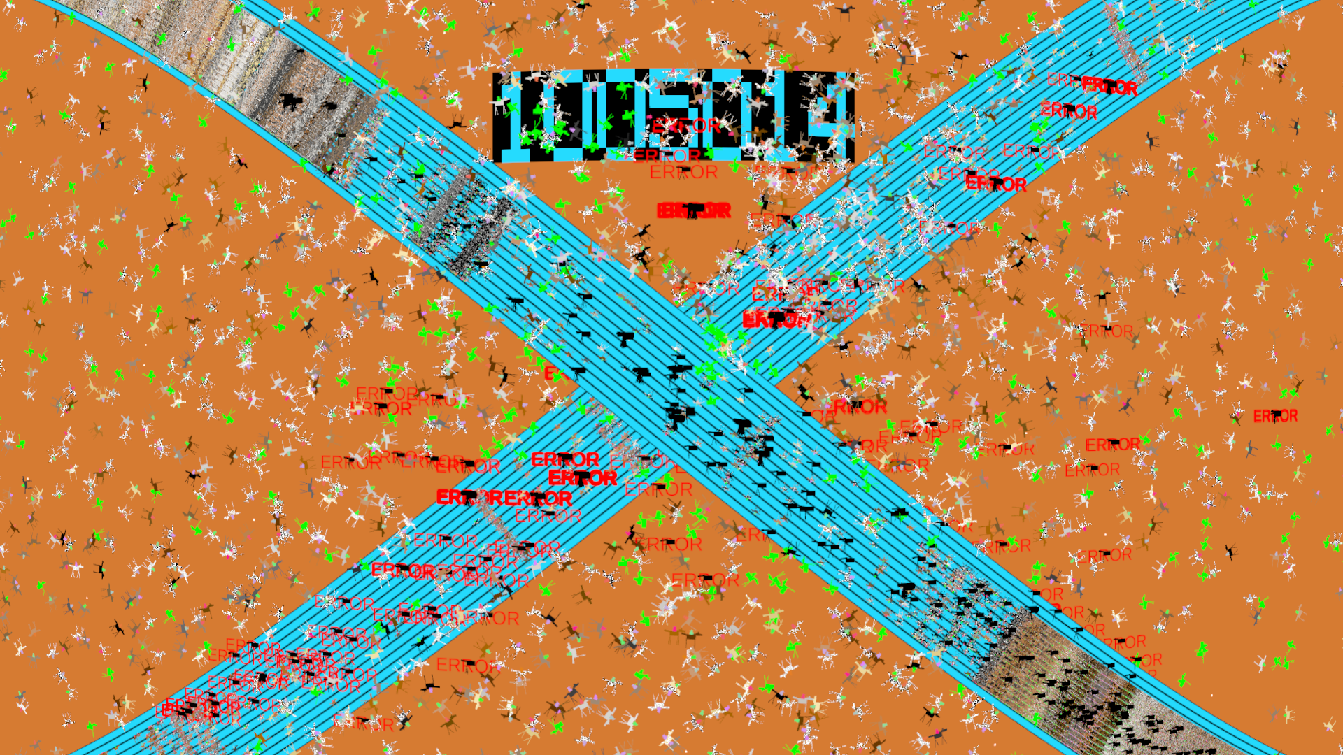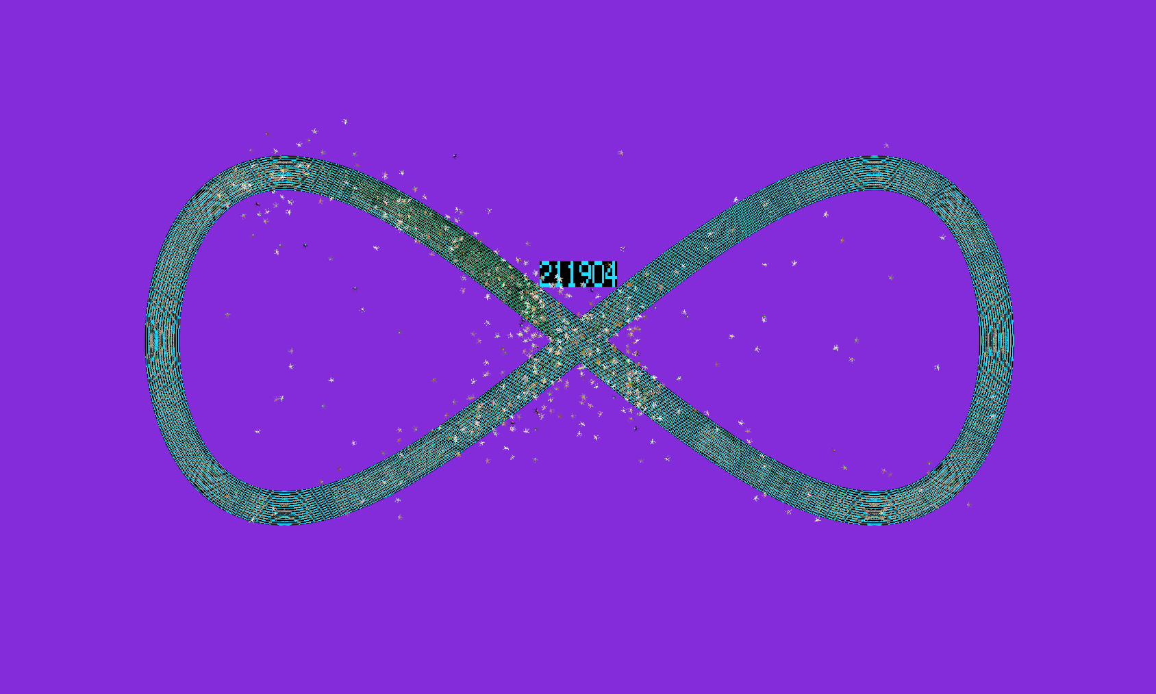 The horses multiply up to a million, What started out as a horse race simulator mutated into a dance party in space. They shrink at strange thresholds, and "dance" in unpredictable ways. They are tiny horses, and they all work their legs on screen at the same time while floating above and around a race track. I almost forgot to mention the space jockeys.