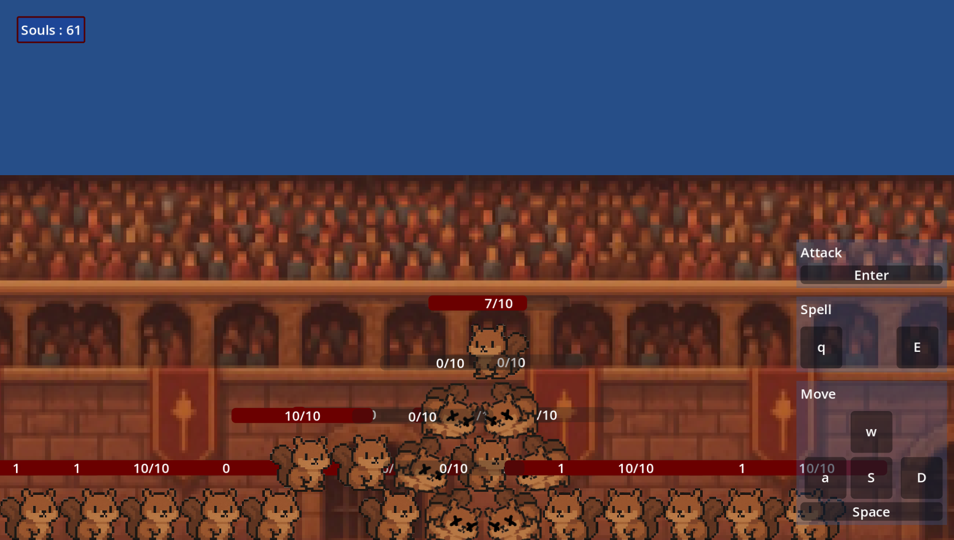 I found that the dead bodies having collision made it really hard to move, especially when big waves of squirrels were attacking. I think making bodies fall behind alive entities would make the game much easier to play.