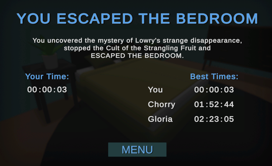 Thanks for playing! It's definitely easy and very short. This was my first jam as a programmer, so I was trying to keep it pretty simple for myself 😄 The leaderboard times were in there just for the illusion that there's like a masterfully crafted 2 hour experience that you've skipped by clipping out of the level haha