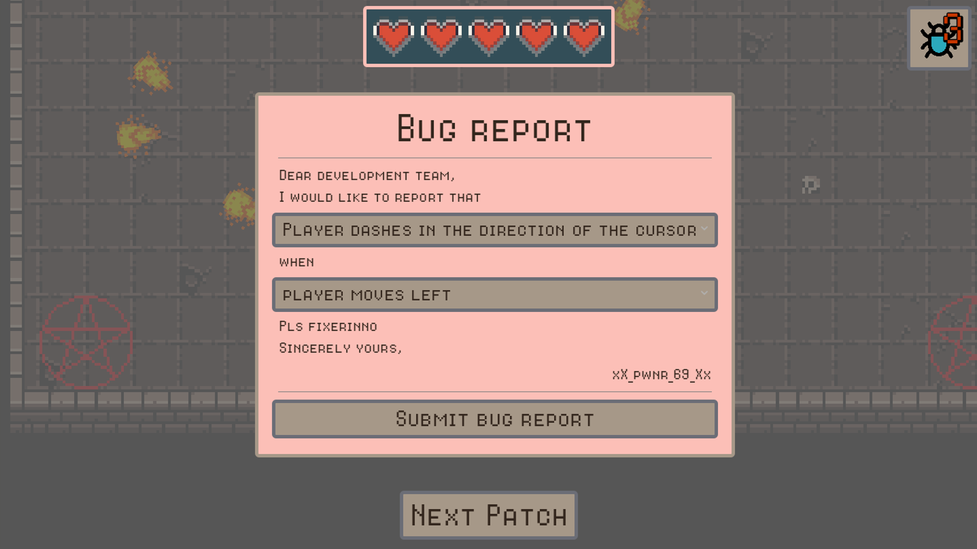 Also, a funny idea, maybe you could have it so that when you report a bug incorrectly, your report could cause the opposite to happen. my first thought was something like reporting that projectiles are not shooting if you move left or something, causing the devs to overcorrect and now you shoot an extra projectile when you move left.