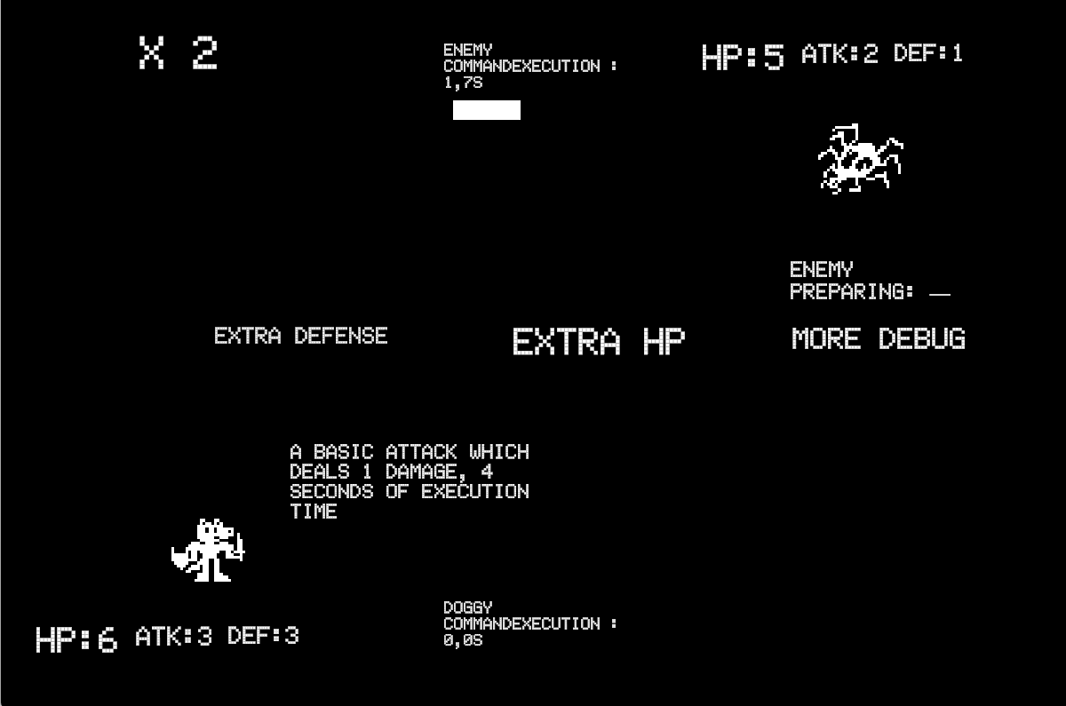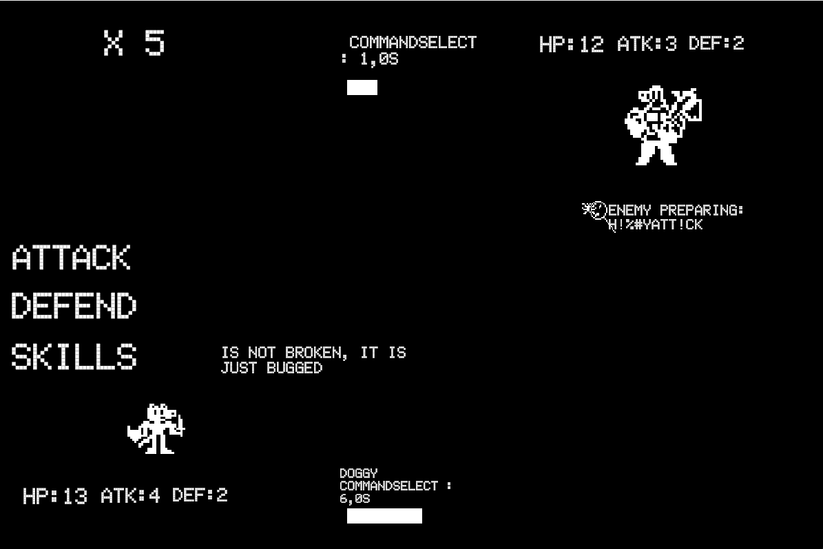 Each button (or enemy command!) has a 20% chances to get bugged, which has a random effect, but you can also use the debugger to control the output of that extra effect! also there should be a couple of bugs here and there because 3 days are 3 days.