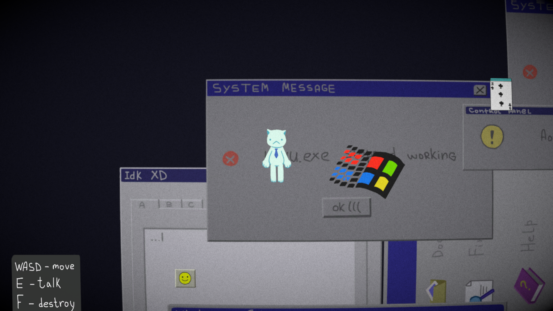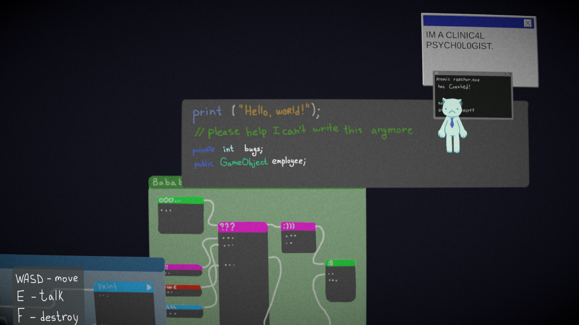 Our game tells a story about little cat-programmer, who needs to make an important decision. He must destroy all the bugs inside the computer because of the boss's order...but bugs turn out to be pretty smart and understanding creatures!
