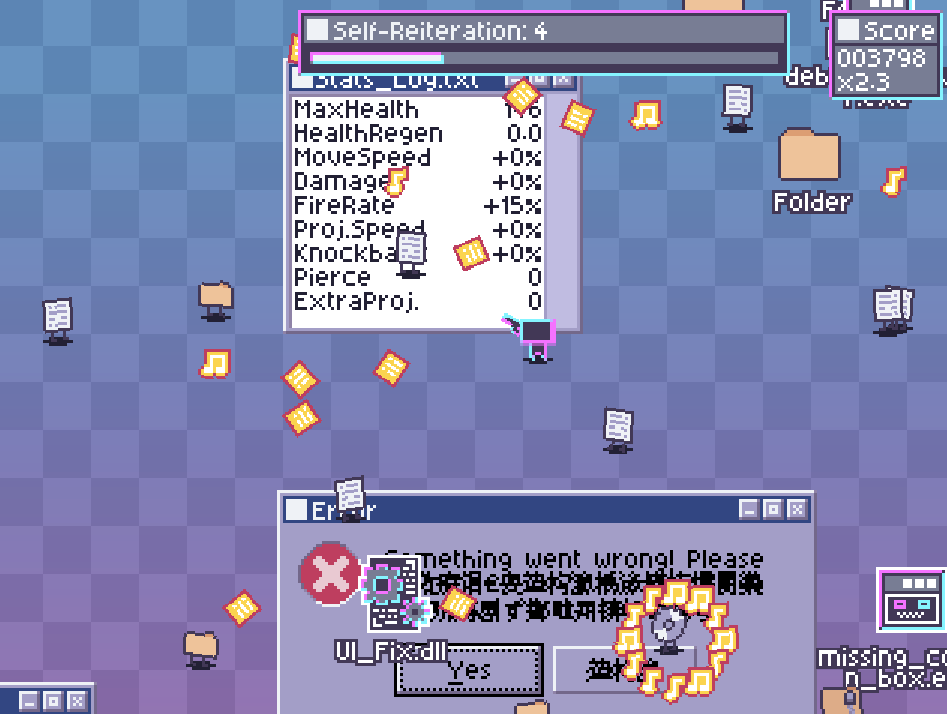 Feels like player progression is slow and enemies end up overwhelming pretty fast. Also was confused if I was supposed to shoot the dropped upgrade files or not and wasted time with that. Also I feel like the play damage upgrade did nothing. But other than that the art is great and is a fun littol romp.