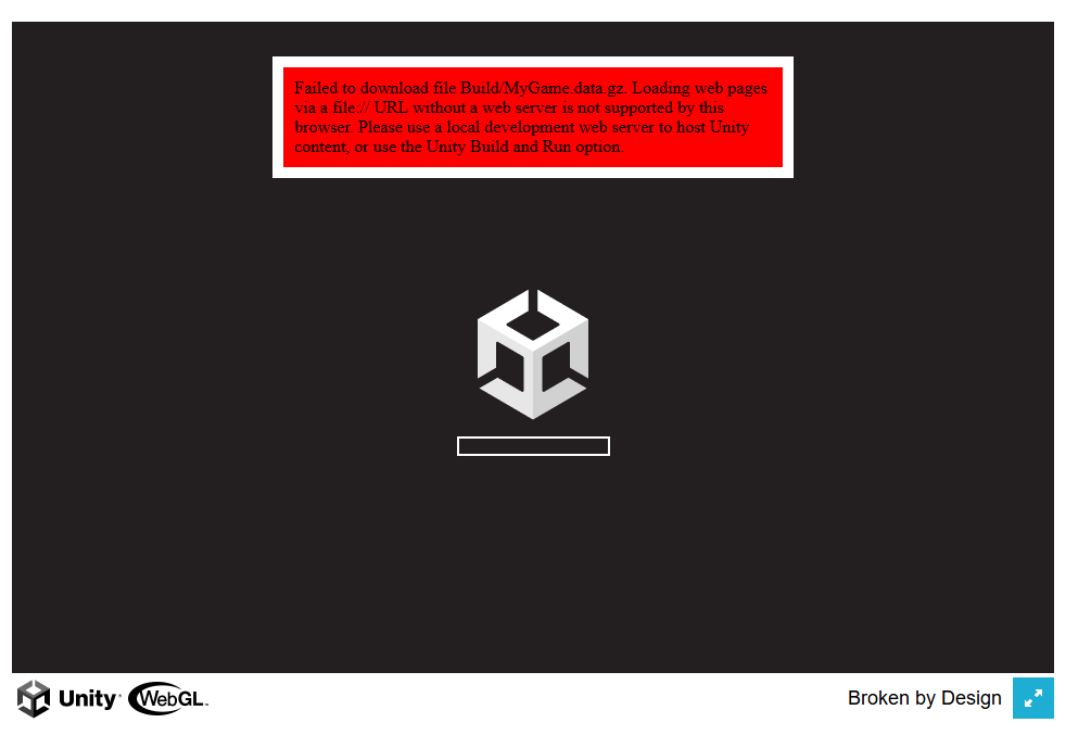 Failed to download file Build/MyGame.data.gz. Loading web pages via a file:// URL without a web server is not supported by this browser. Please use a local development web server to host Unity content, or use the Unity Build and Run option.