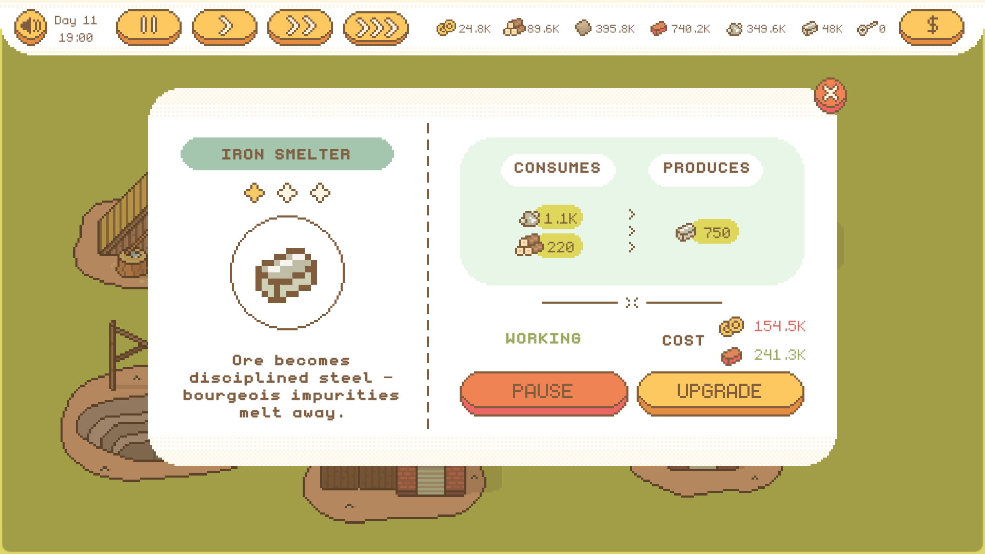 Very fun game, the art and sound are great too. Maybe I missclicked and didn´t notice it but somehow the factorys turned of at random times and halted my progress. Otherwise it is super polished.
