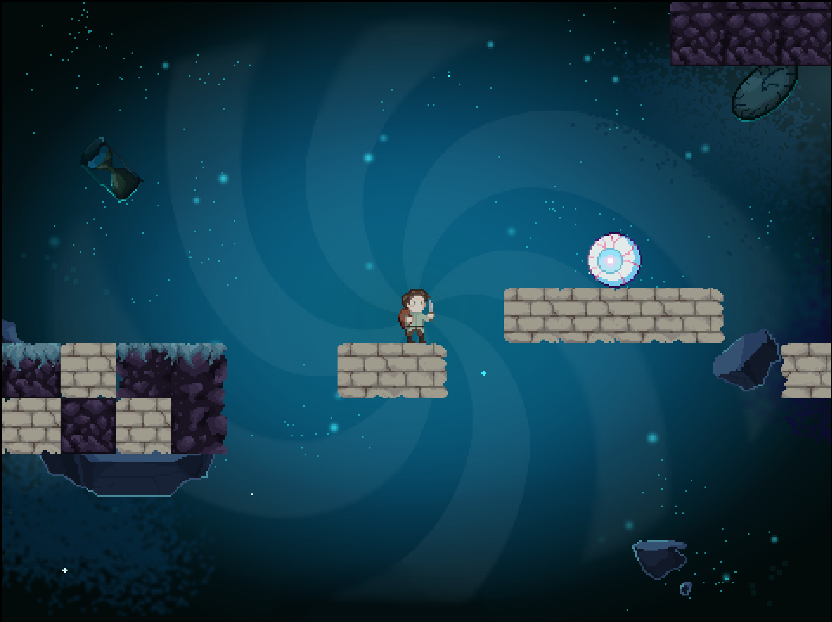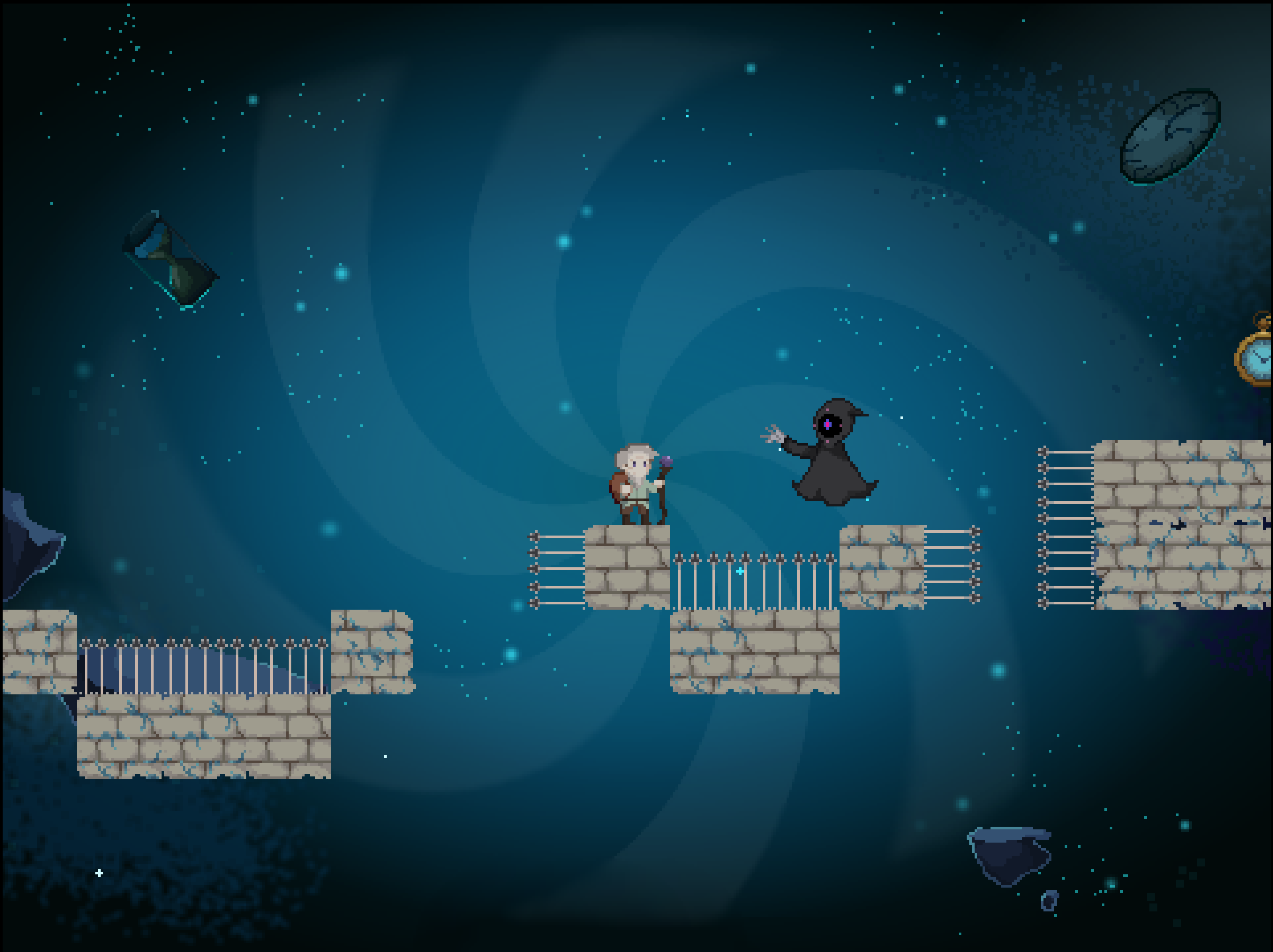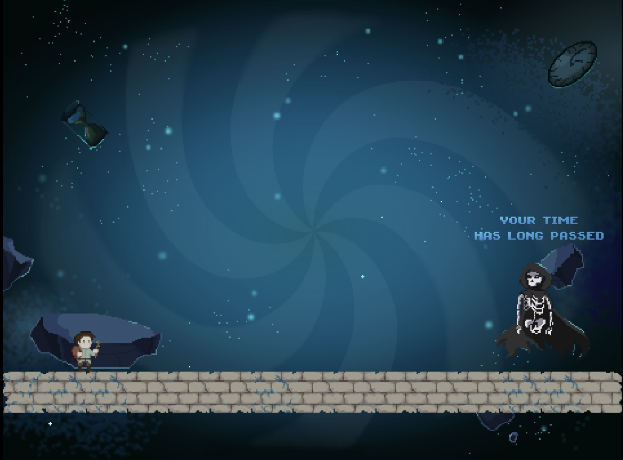 The game's main mechanic is that time is a resource, your hp in the game is tied to your age. The more you are hit the more you age and if you are OUT OF TIME you die. The game aesthetic is also a void that is stuck out side of time itself.