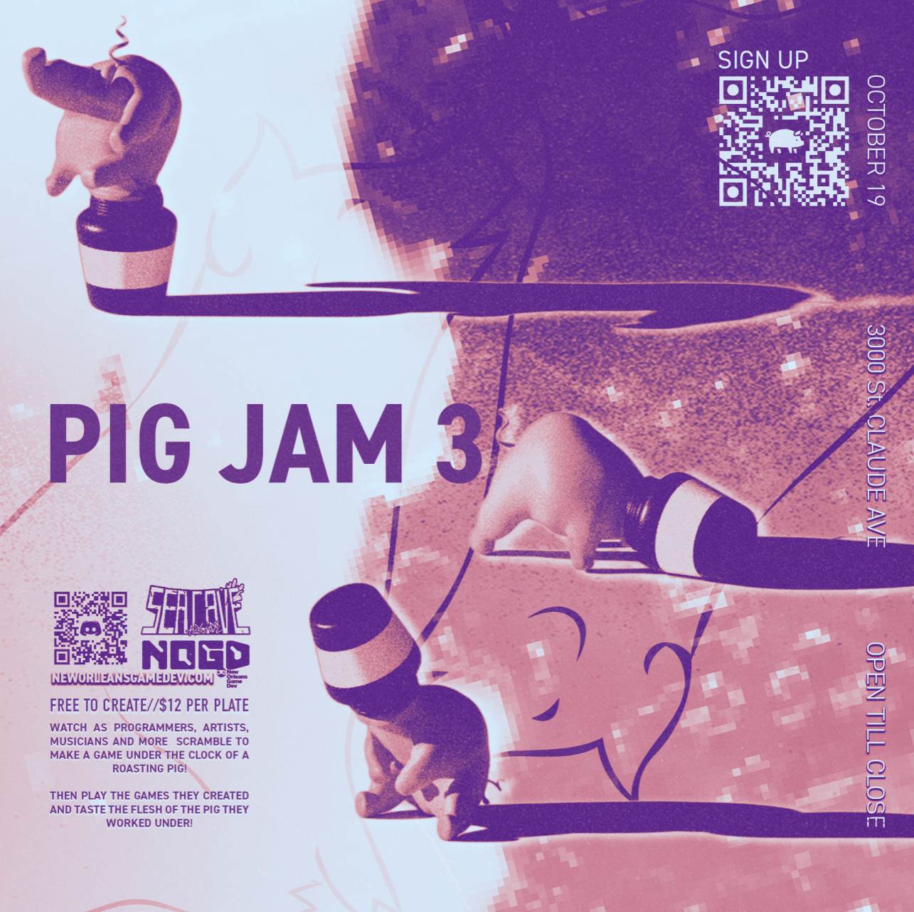 We're doing a PIG ROAST FALL JAM on 10/19/25. We'll be getting an entire pig, and it'll be roasted at Sea Cave Arcade (3000 St Claude Ave). While the pig is roasting, you have approximately 10 hours to make a game. Participants will be served pig at the end of the roast and be provided refreshments during the jam.