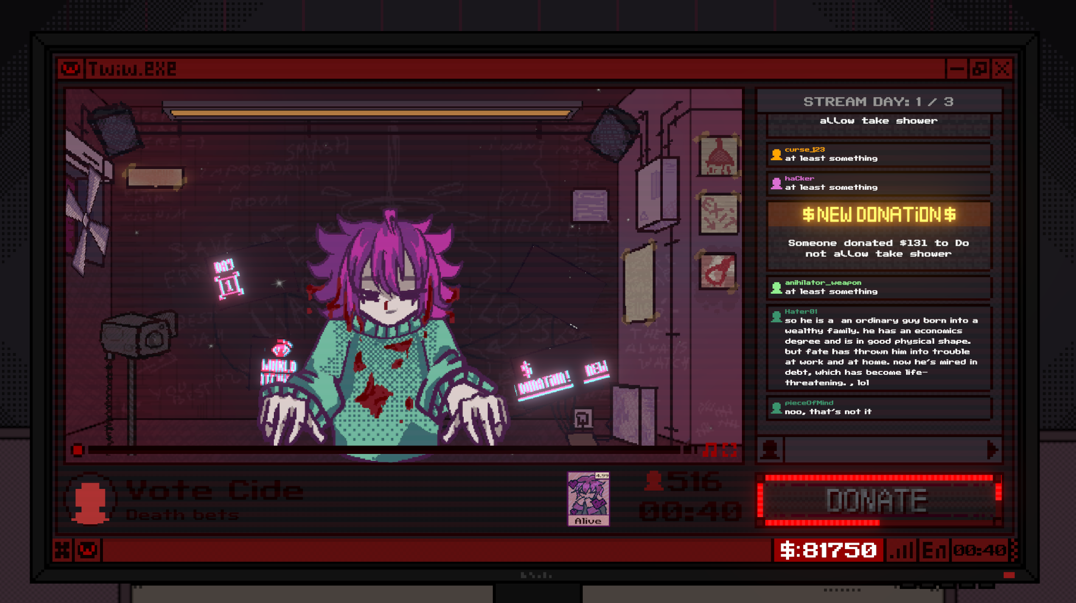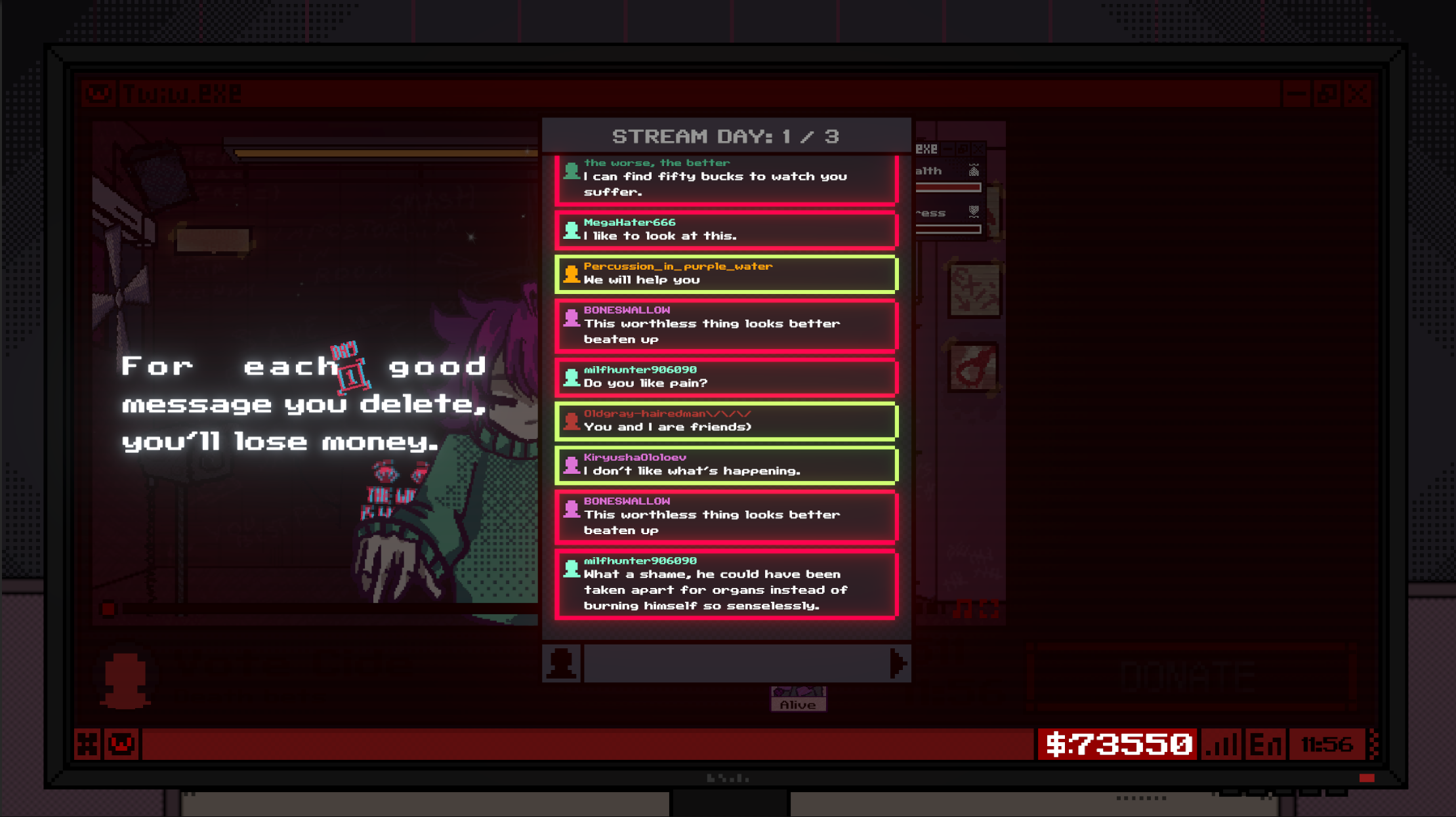 Very cool vibe to it from the art direction. I did find it a bit confusing when it came to actual gameplay. I mostly just like spam click deleting chat messages. Maybe changing the penalty from losing money (which honestly I didn't notice how much money I was gaining or losing from it) to instead be you cant delete another chat message for 1 second or something when you delete a good message.